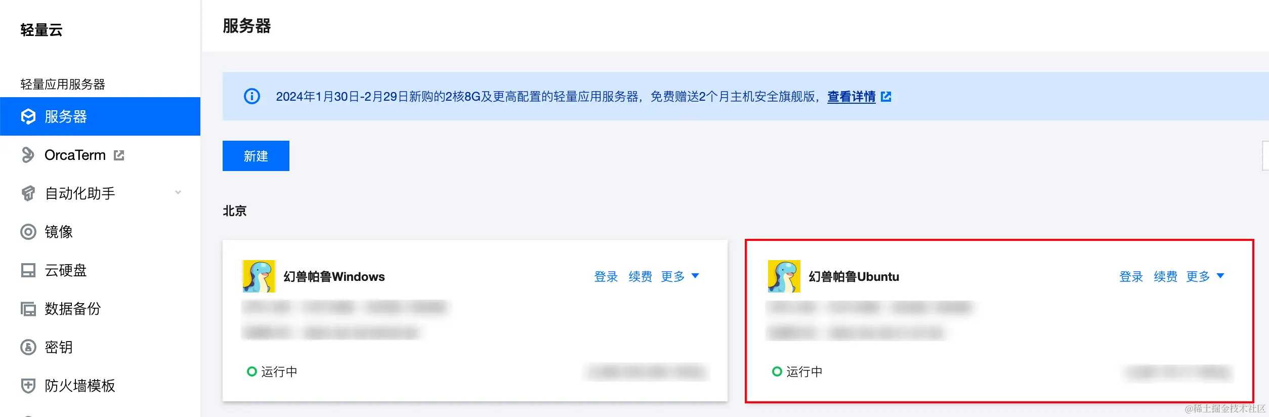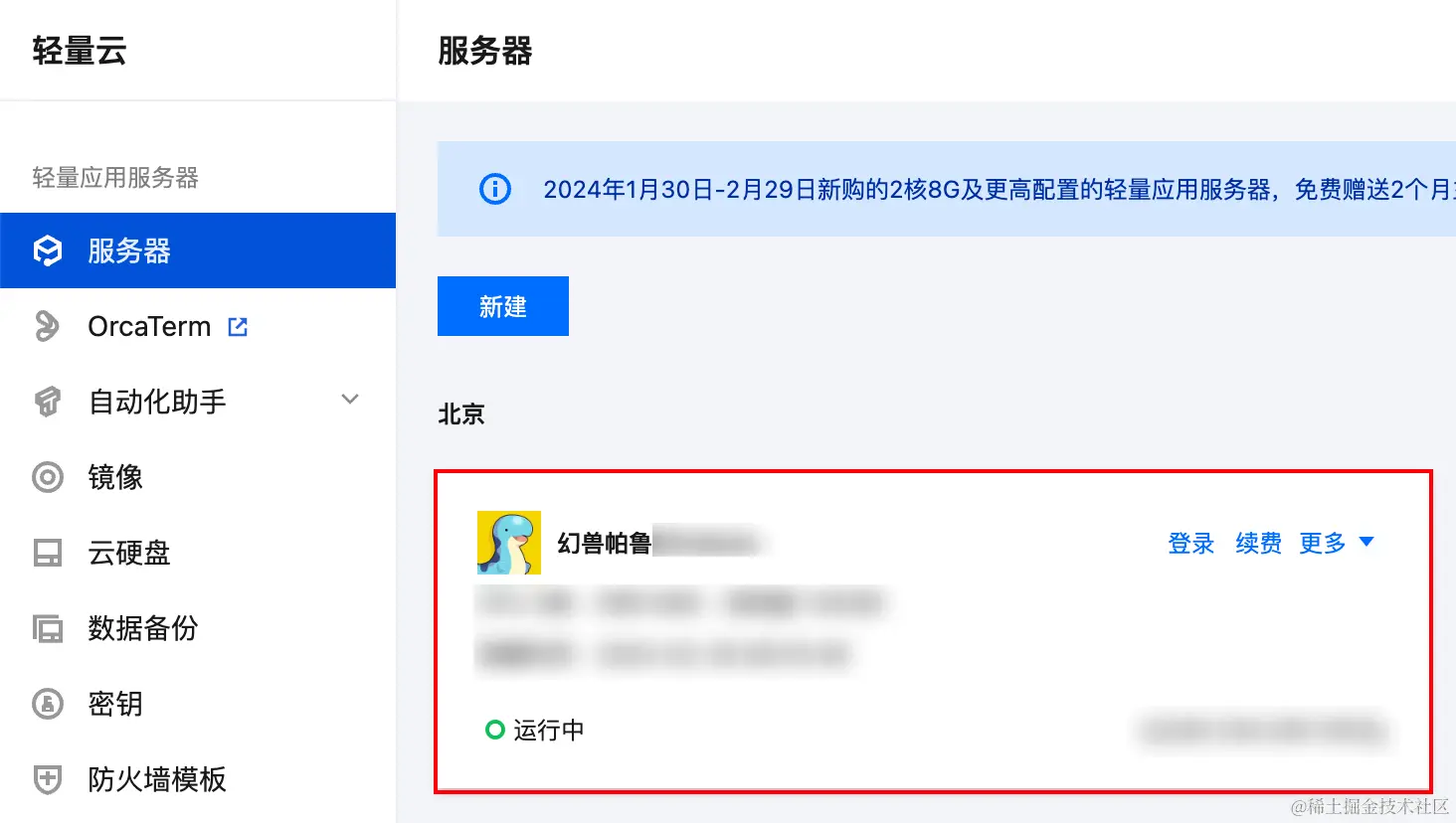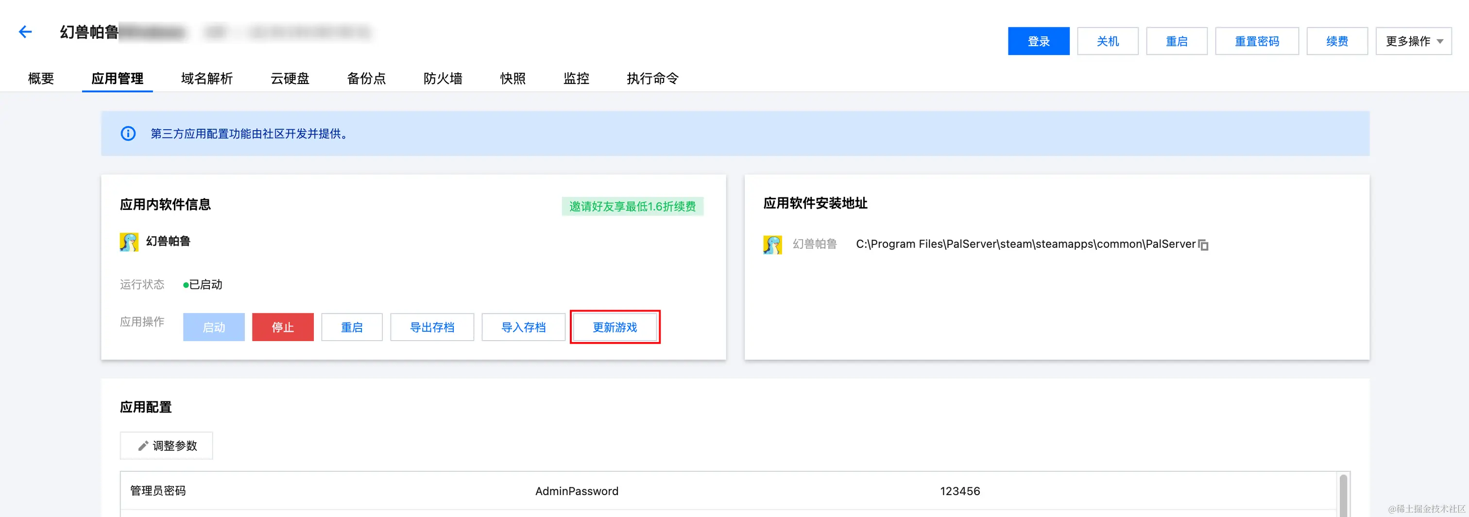 1、登录轻量云控制台,点击你想要更新幻兽帕鲁的服务器,进入详情页,并找到“应用管理”。
