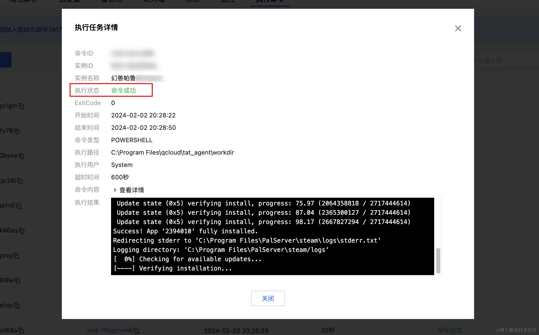 更新过程可能持续 1- 5分钟,如果你想要查看更新的进度,可以进入“执行命令”页签,找到“命令运行中”的任务,并点击【查看执行详情】按钮,可查看更新的进度。
