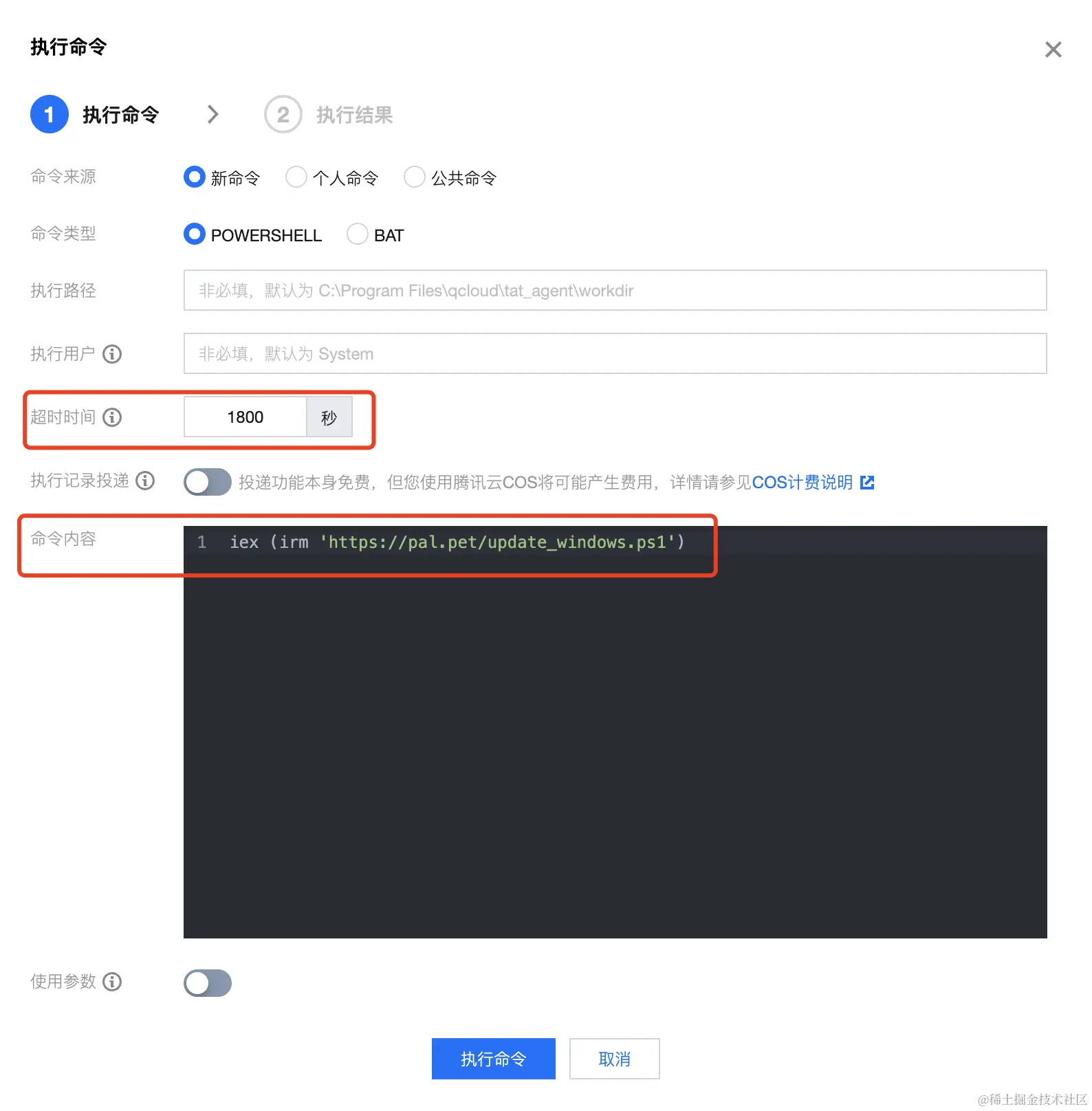 2、单击【执行命令】按钮,在弹窗中依次输入下面的内容后,点击【执行命令】: