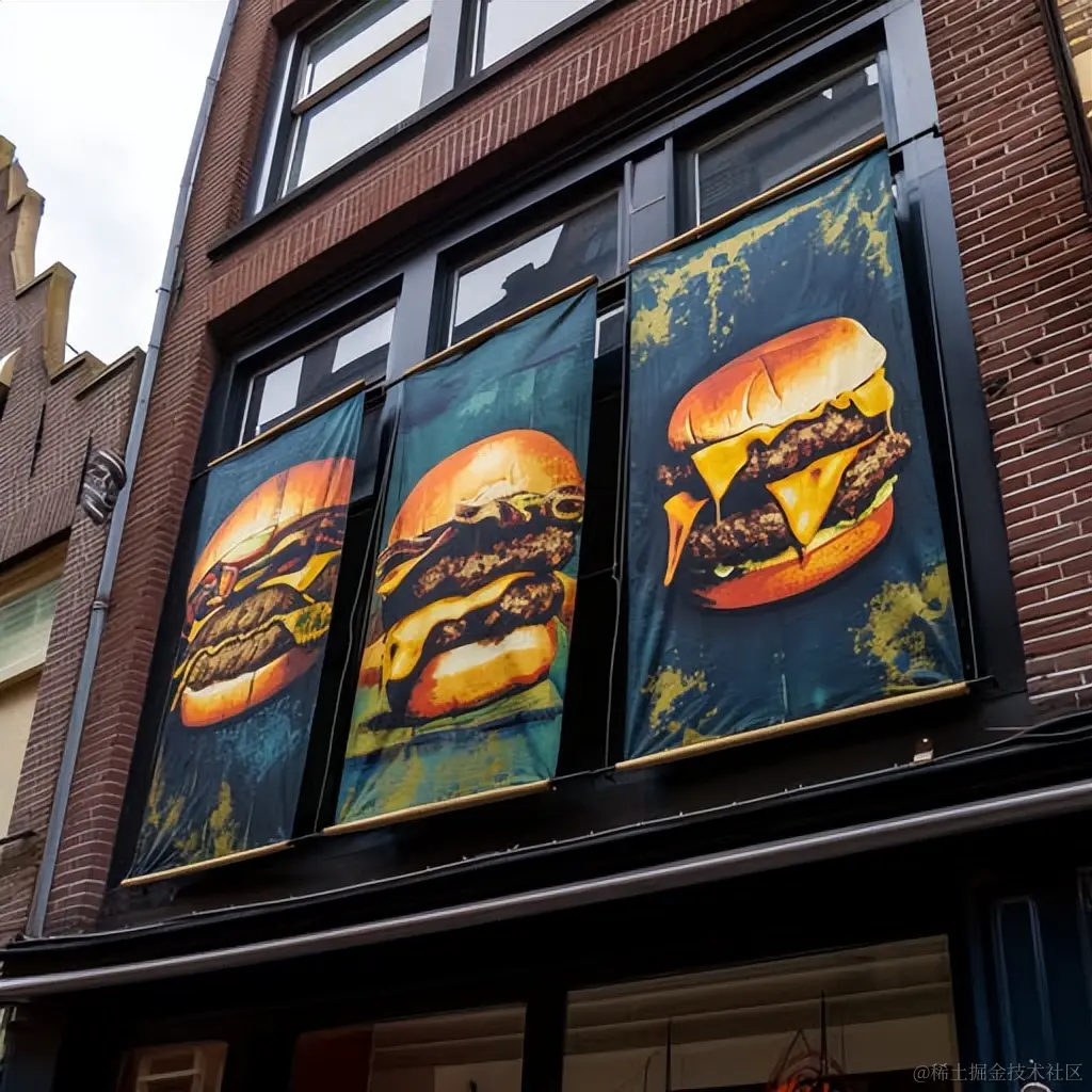 荷兰风景画风格的汉堡广告。以浓烈的金色和深青色为主,这组广告通过醒目的字体和奶酪制成的生动场景,展示了一种令人陶醉的“drugcore”氛围。这种dadaist的设计巧妙地将传统与前卫相结合,呈现出一种独特而生动的画面,仿佛是一幅荷兰风景画中的瞬间抓拍。