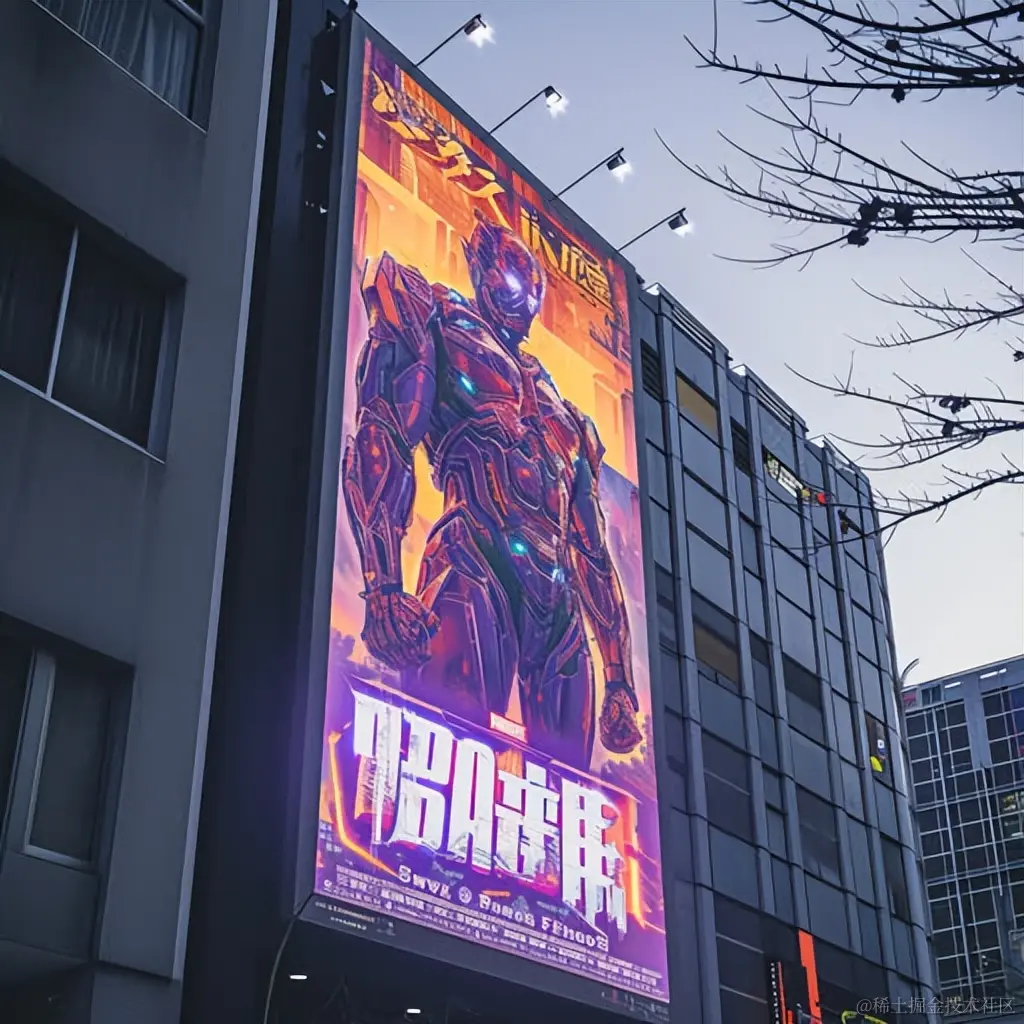 一则广告挂在室外墙面上,风格采用虚幻引擎5,新地理,电影海报,超级英雄,设计精细,浅紫色和橙色,新达达主义。