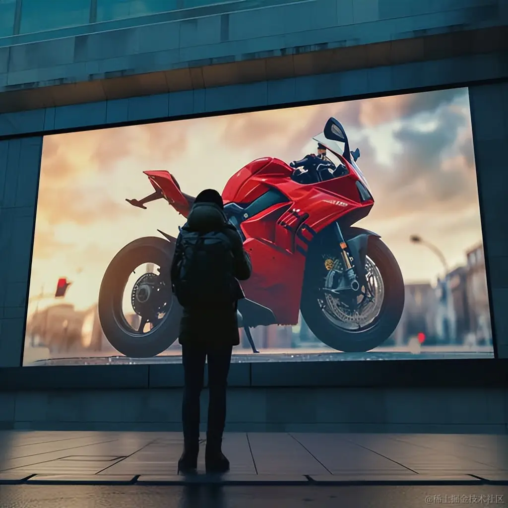 站在大型广告牌前的人,广告牌上有一辆摩托车,采用vray追踪风格,街头场景,32k超高清,尼古拉斯·范·费伦代尔风格,真实动物肖像,静物,特写。