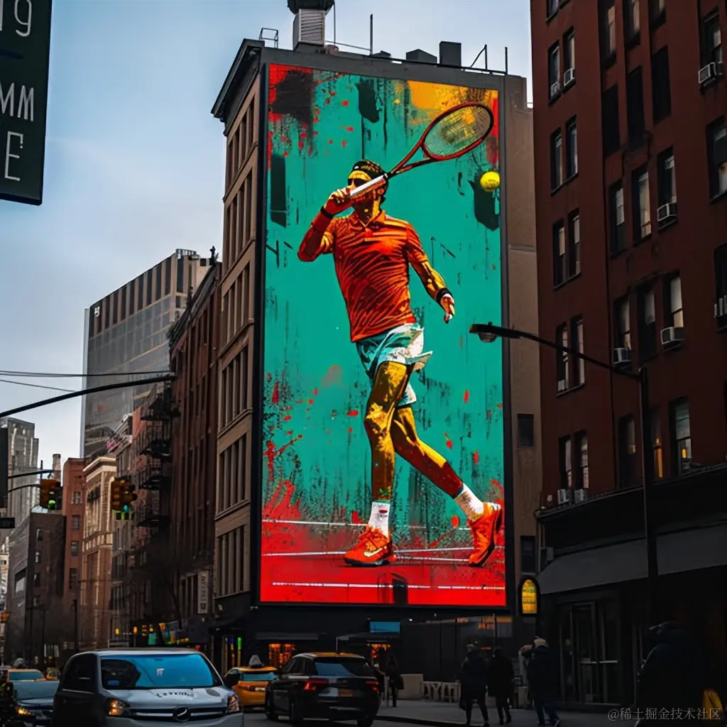 网球广告PSD模板设计,采用深青色和琥珀色风格,大规模公共艺术,纽约学派,32k超高清,红色和翠绿色,佳能af35m相机,街头风景。