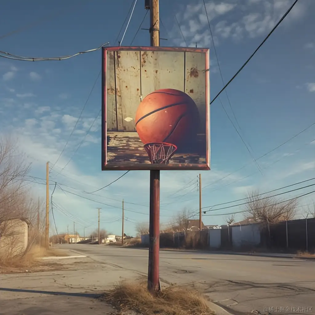 一块横幅挂在杆上,上面有篮球的广告,采用摄影风格,大胆的图形插图,草原核心,投影映射,超现实主义壁画,逼真细致的渲染,独特的构图和框架。
