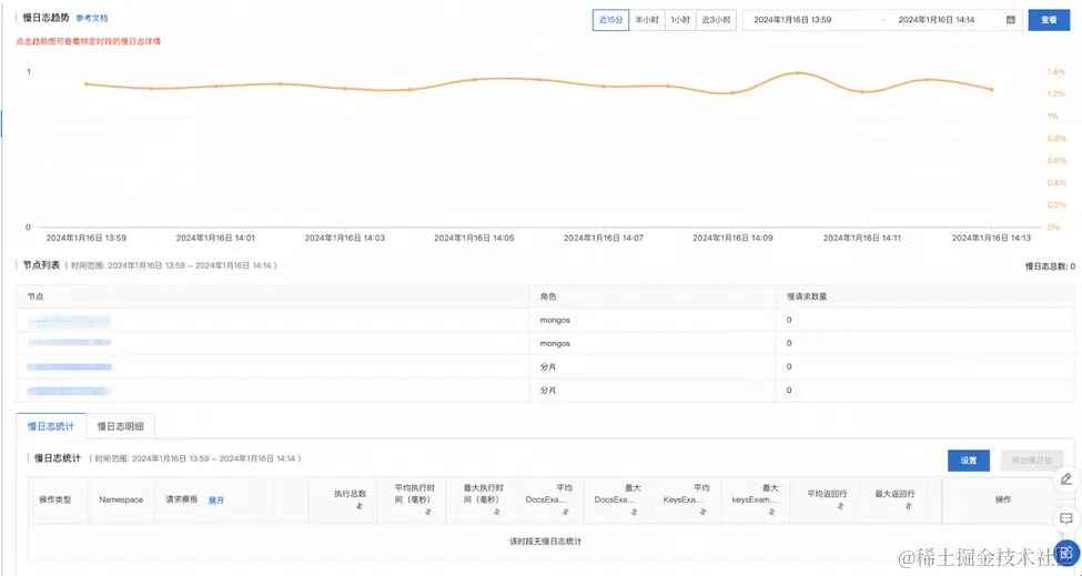 您可以进入阿里云MongoDB控制台,在目标实例页面的左侧导航栏,单击 CloudDBA > 慢日志。在慢日志页面可以查看实例的慢日志趋势、节点列表、慢日志统计和慢日志明细。
