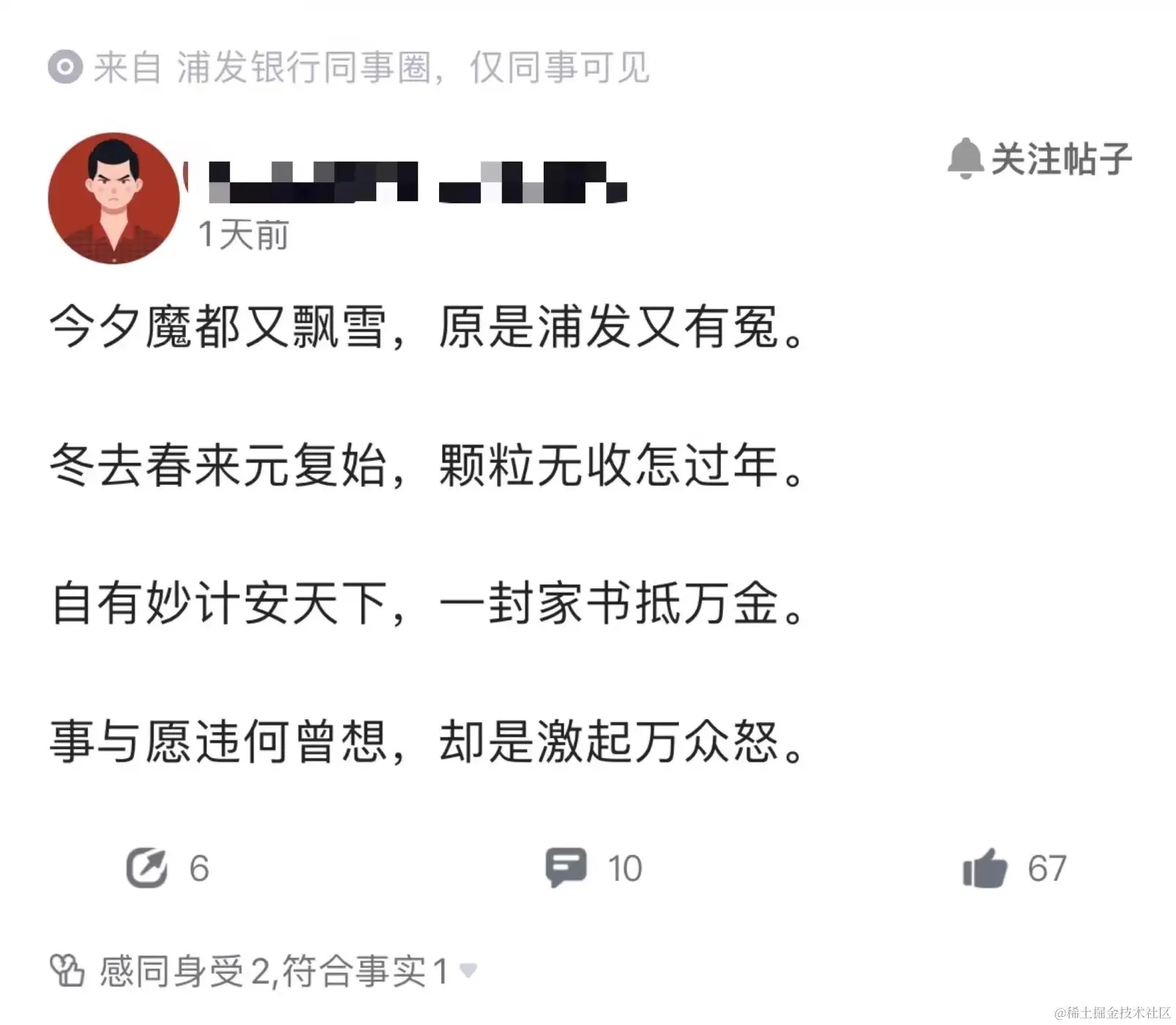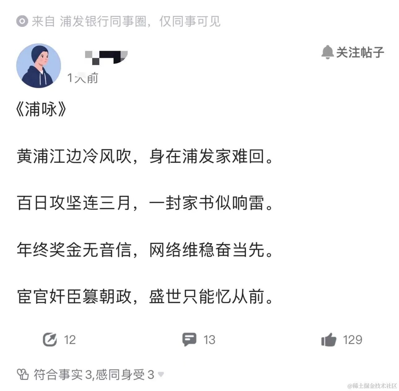 甚至还有仅「浦发银行同事圈」可见的帖子被曝光: