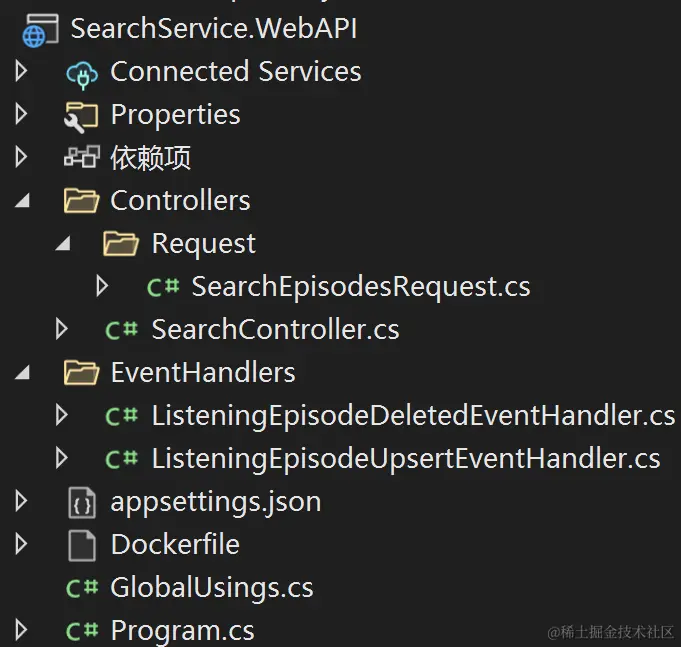 在本搜索服务的应用层,编写一个监听这个集成事件的处理器ListeningEpisodeUpsertEventHandler ,然后把原文等数据写入Elastic Search