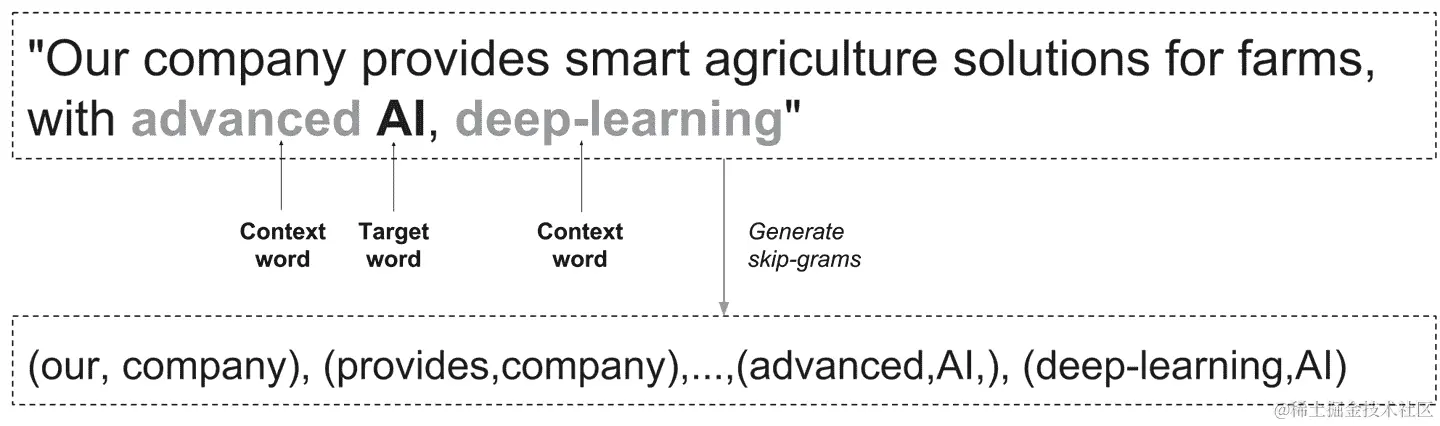 在跳字 word2vec 模型中,我们训练一个模型来根据输入词预测上下文。在这种情况下,这意味着我们生成训练实例和标签对,如(our,company),(provides,company),(advanced,AI),(deep-learning,AI),等等。