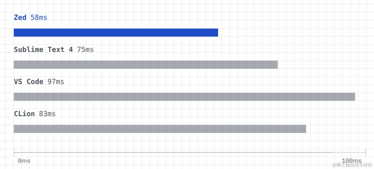 效率优先:Zed的设计思路就是极致效率,从编辑器的性能和响应速度,到融合AI来提升产出效率,都彰显出效率优先的本质。尤其在速度方面,官方也给出了直观的对比。