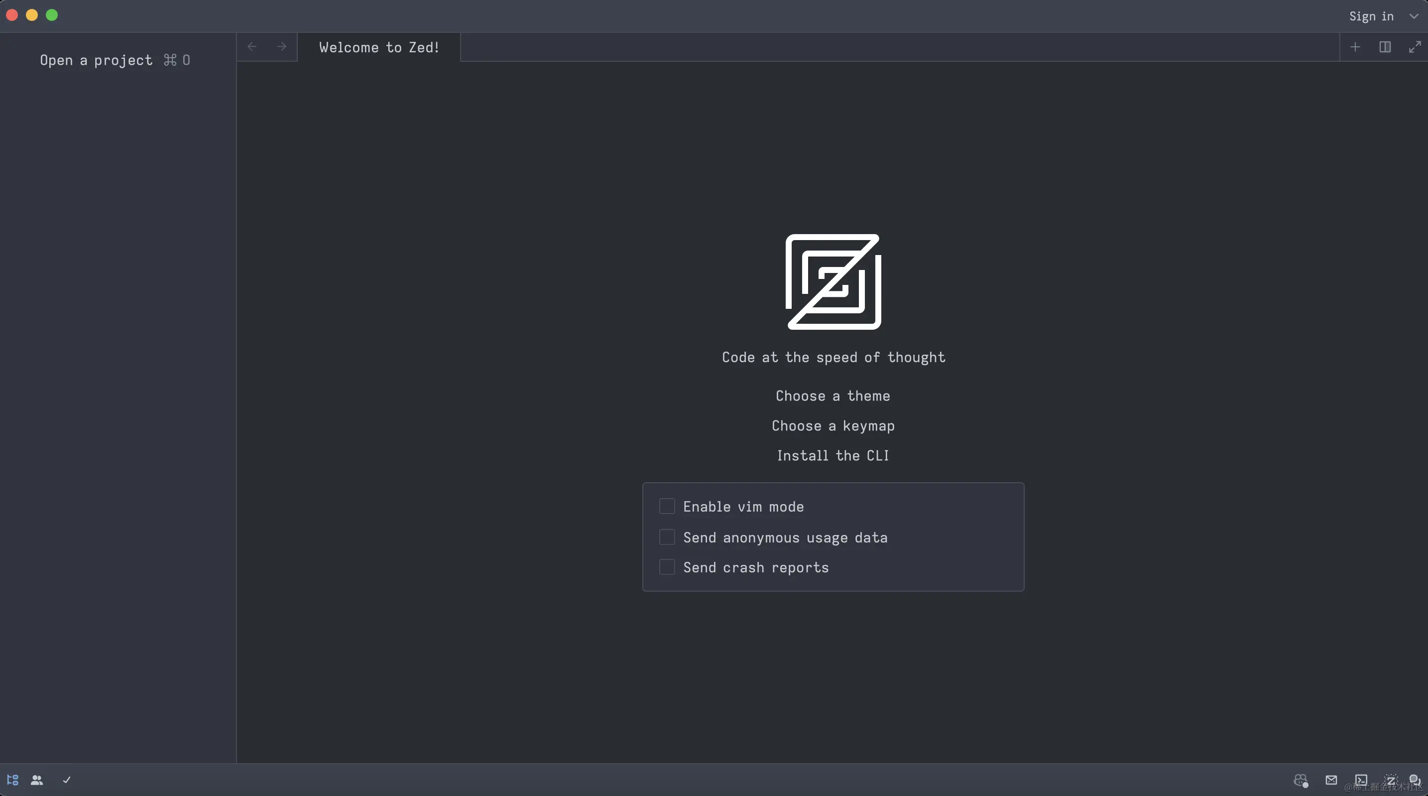 打开zed的欢迎页是这个样子的,这里提示我们要选择样式,选择keymap和安装 CLI。