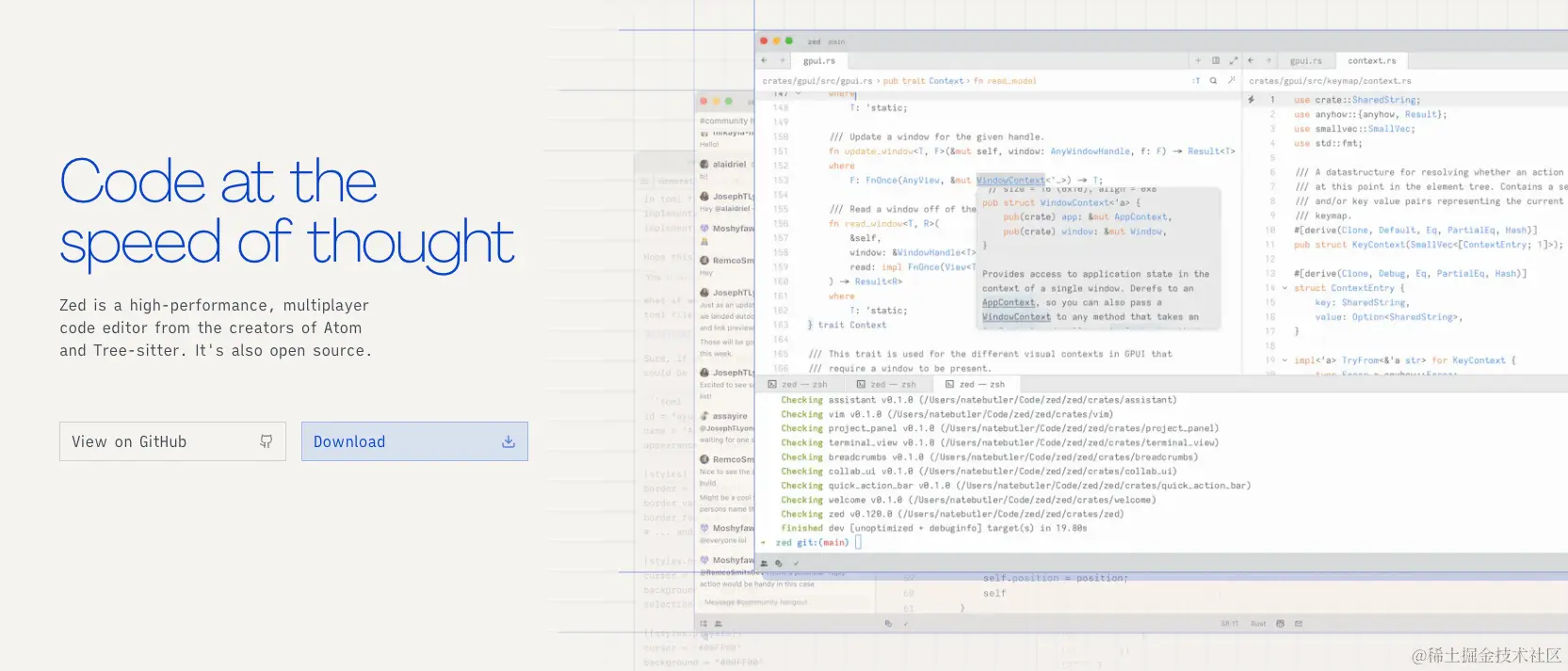 Zed的来头可不小,它是由Atom和Tree-sitter的创建者开发的高性能多人代码编辑器,可能是atom最终败给VScode 心有不甘,于是他们再次踏上了追求终极编辑器之路。