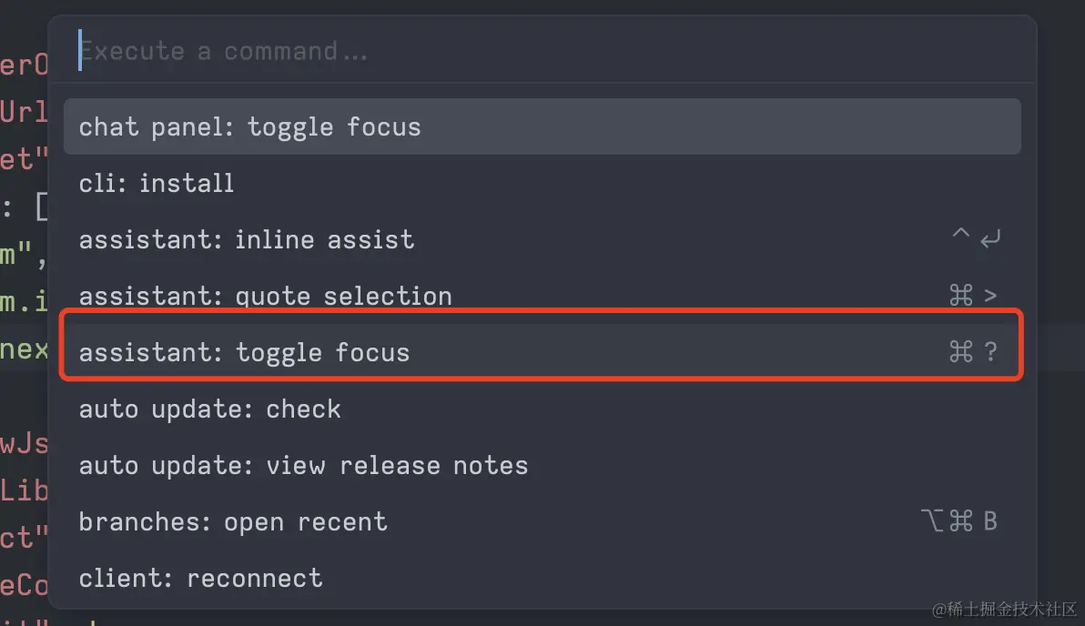 通过cmd+shift+p打开命令窗口打开,之后打开assistant:toggle focus