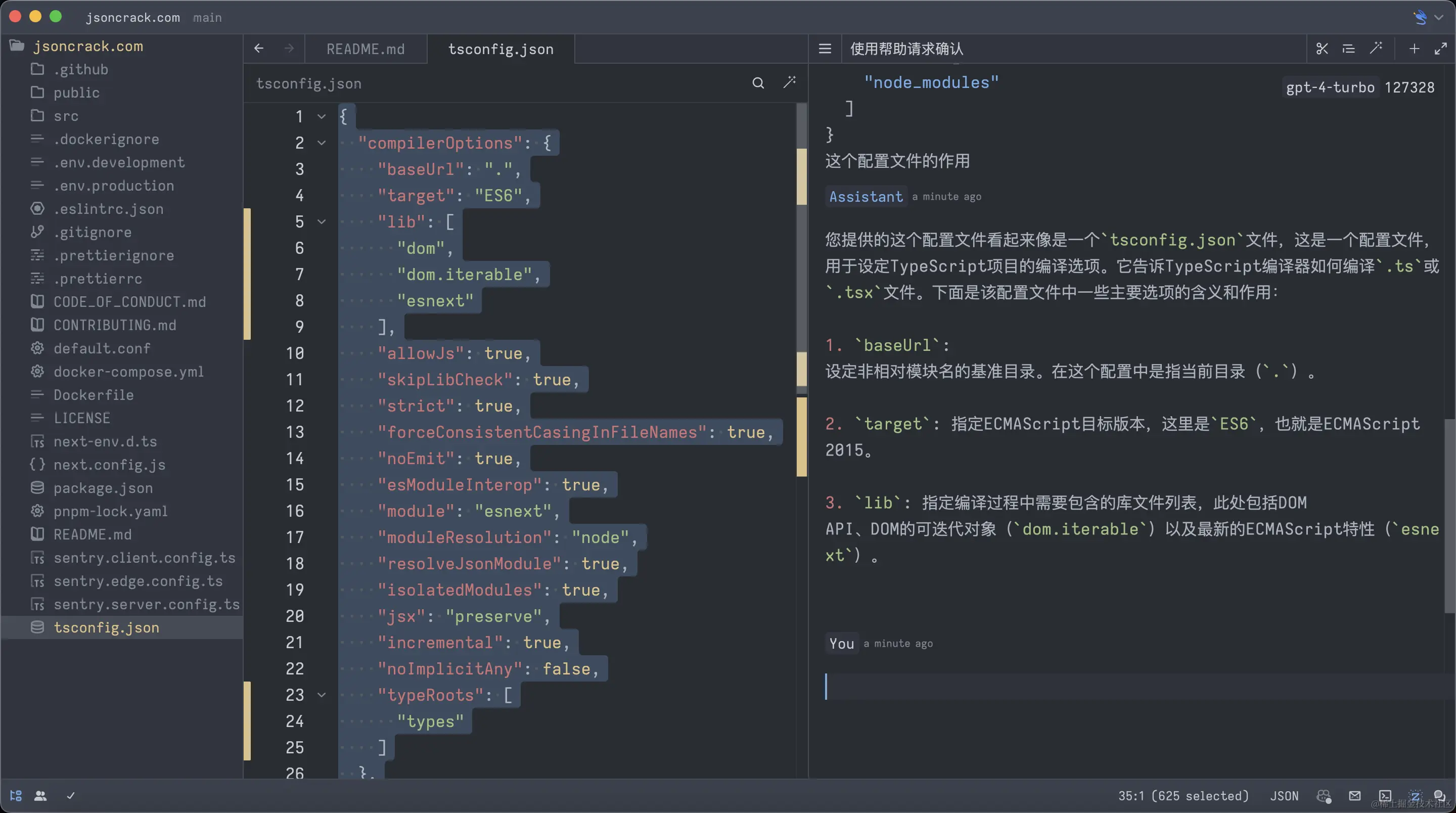 配置好后,使用上来说,就是相当于右侧开了一个ChatGPT,并且和IDE做了更多的整合,用起来方便一些。比如选择一段代码,可以直接通过cmd-> (assistant: quote selection)将代码发送到助手面板。