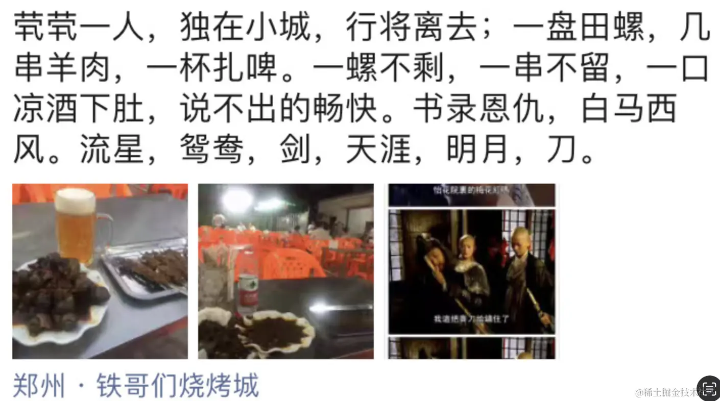 后来去南方求学务工,像千年前同是弱冠之年南下的同乡辛稼轩。这一晃近10年没能北归,也习惯他乡作故里在此终老。在看不对眼的城市,对并不算吃货的我,不多的几处亮点,竟是三五瓦舍几盘田螺 --- 那感觉实在是好,口感筋弹,入味三分。以至于后来一年中秋,去某市小住,心头最为期待,不是火红的革命旧迹,亦非打卡幼年邮票上的5A景区,而是当年那个极是小众的品牌,在外市开出的第一家加盟店面。千山万水,为那一种老滋味。…工作以后,确乎发现,那衣食无忧,亦有大把时间的四年,年轻时仅有一次。我过得比99%的人充实,但过后看其实还能再好。