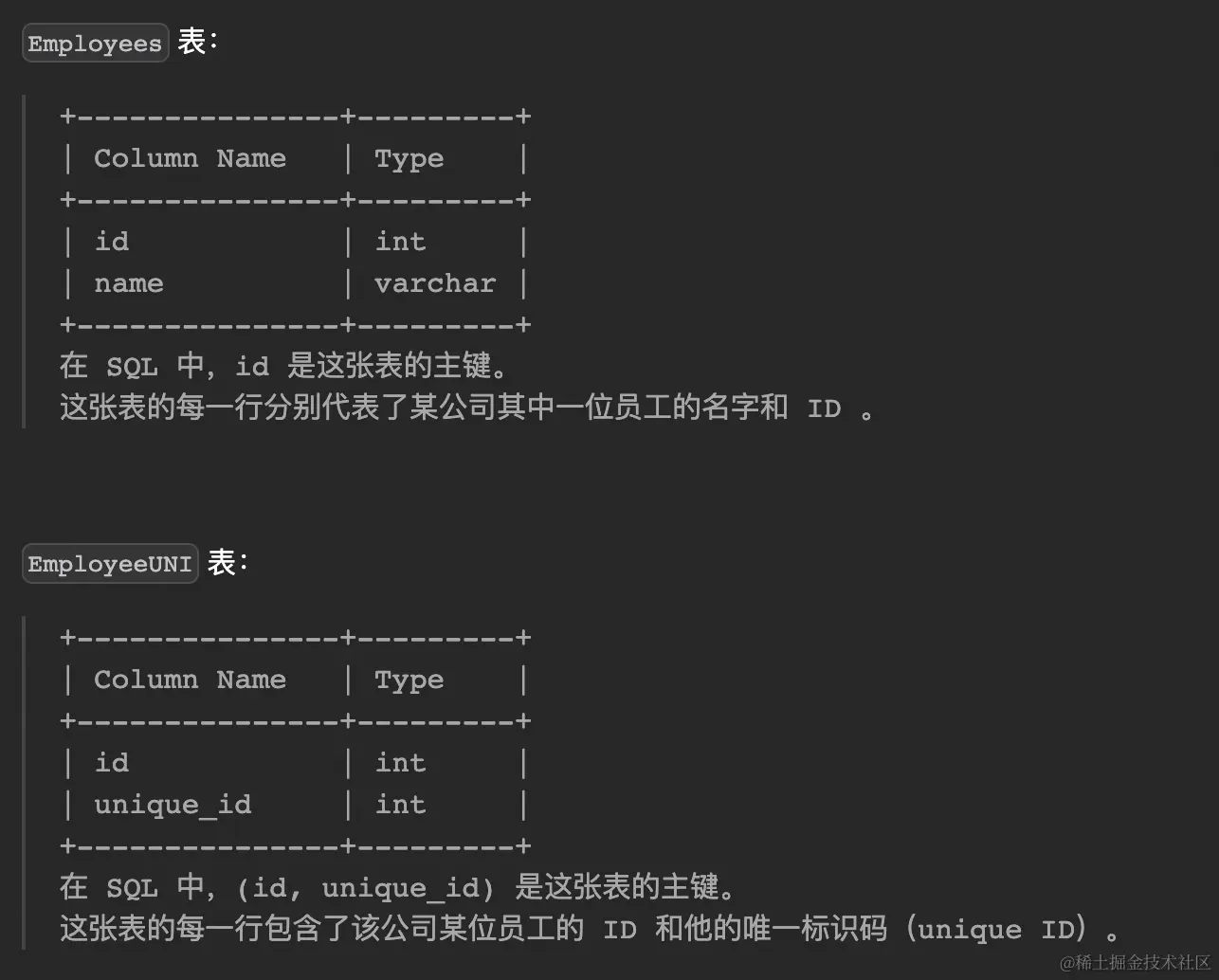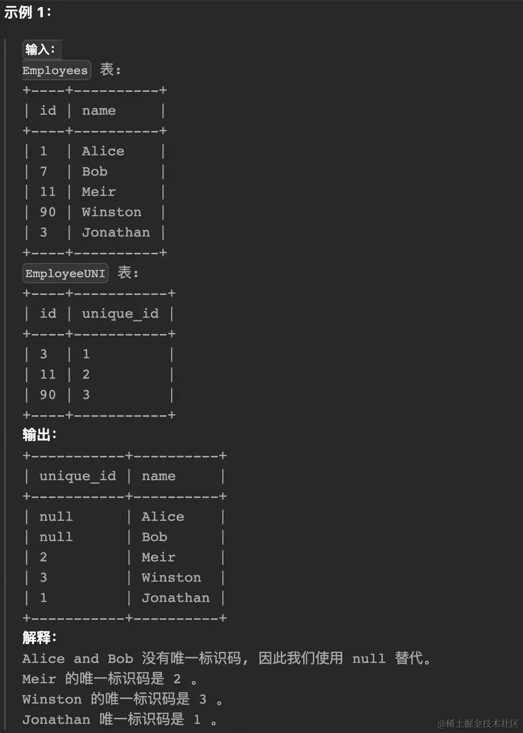这里有个要求:如果某位员工没有唯一标识码,使用 null 填充即可。