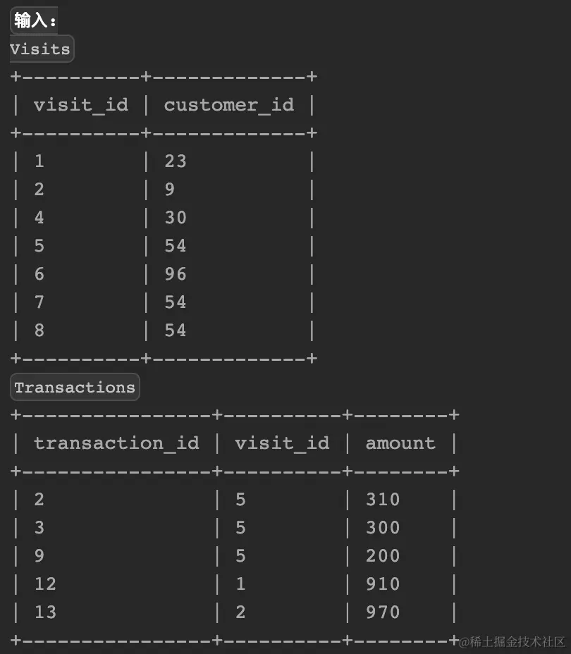 有一些顾客可能光顾了购物中心但没有进行交易。请你编写一个解决方案,来查找这些顾客的 ID ,以及他们只光顾不交易的次数。