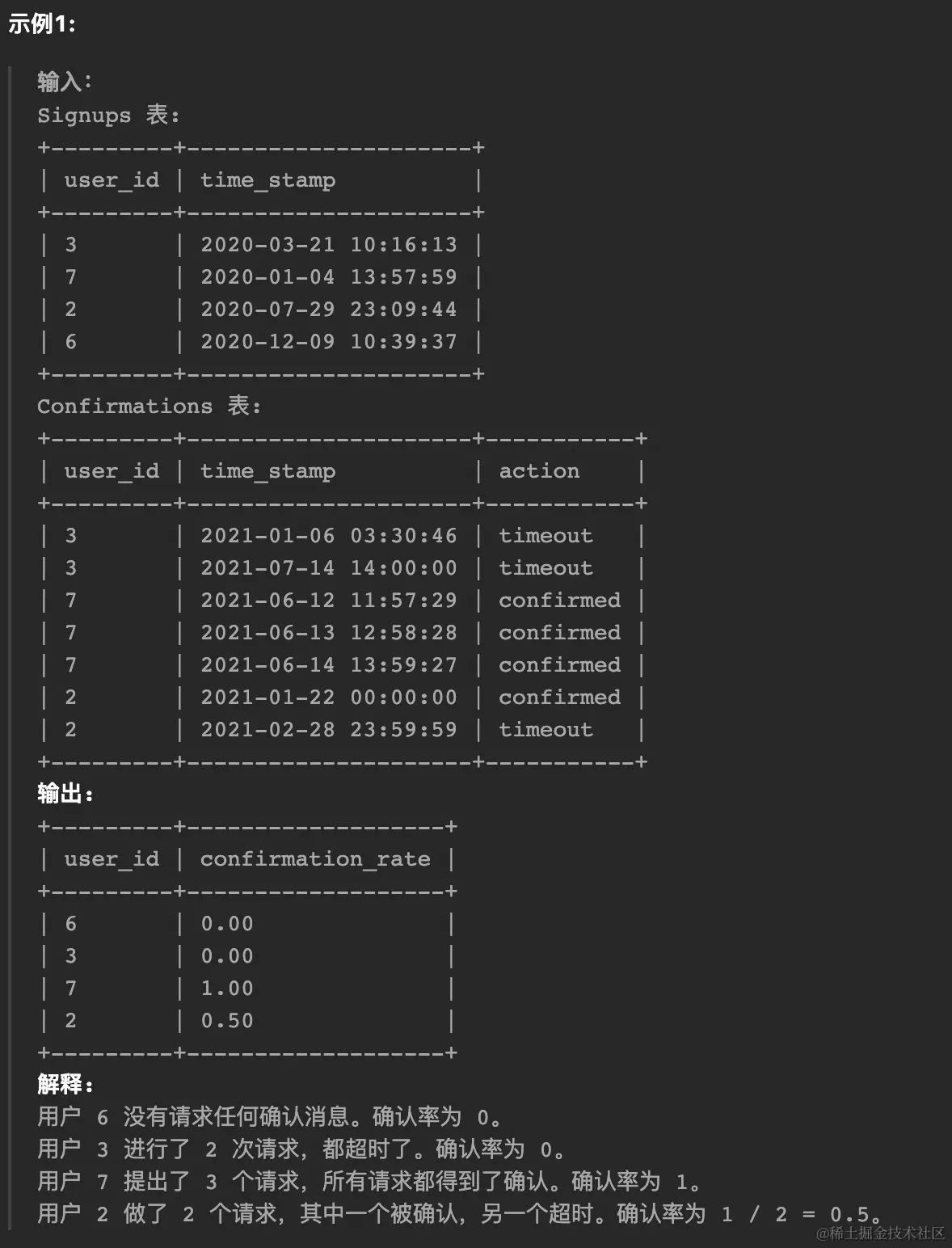 用户的 确认率 是 'confirmed' 消息的数量除以请求的确认消息的总数。没有请求任何确认消息的用户的确认率为 0 。确认率四舍五入到 小数点后两位 。
