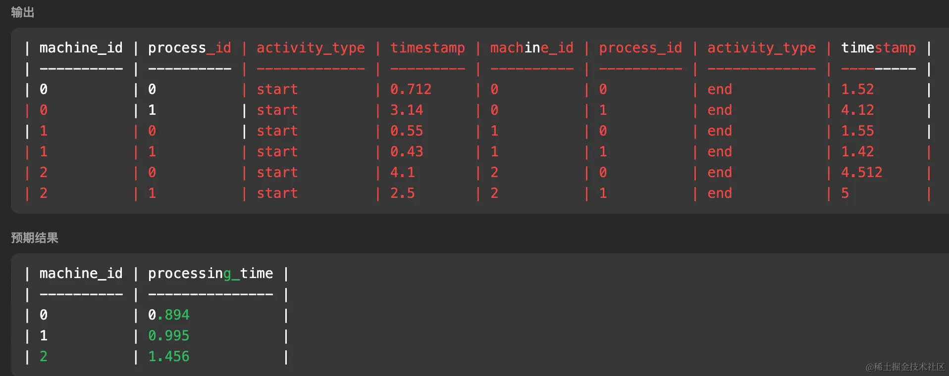 - 表先内连接,组成一个查询结果。连接的条件比较复杂,前边取开始时间,后边取结束时间,然后再通过自身的 process_id 拼接起来。结果行中包含起始、结束时间: