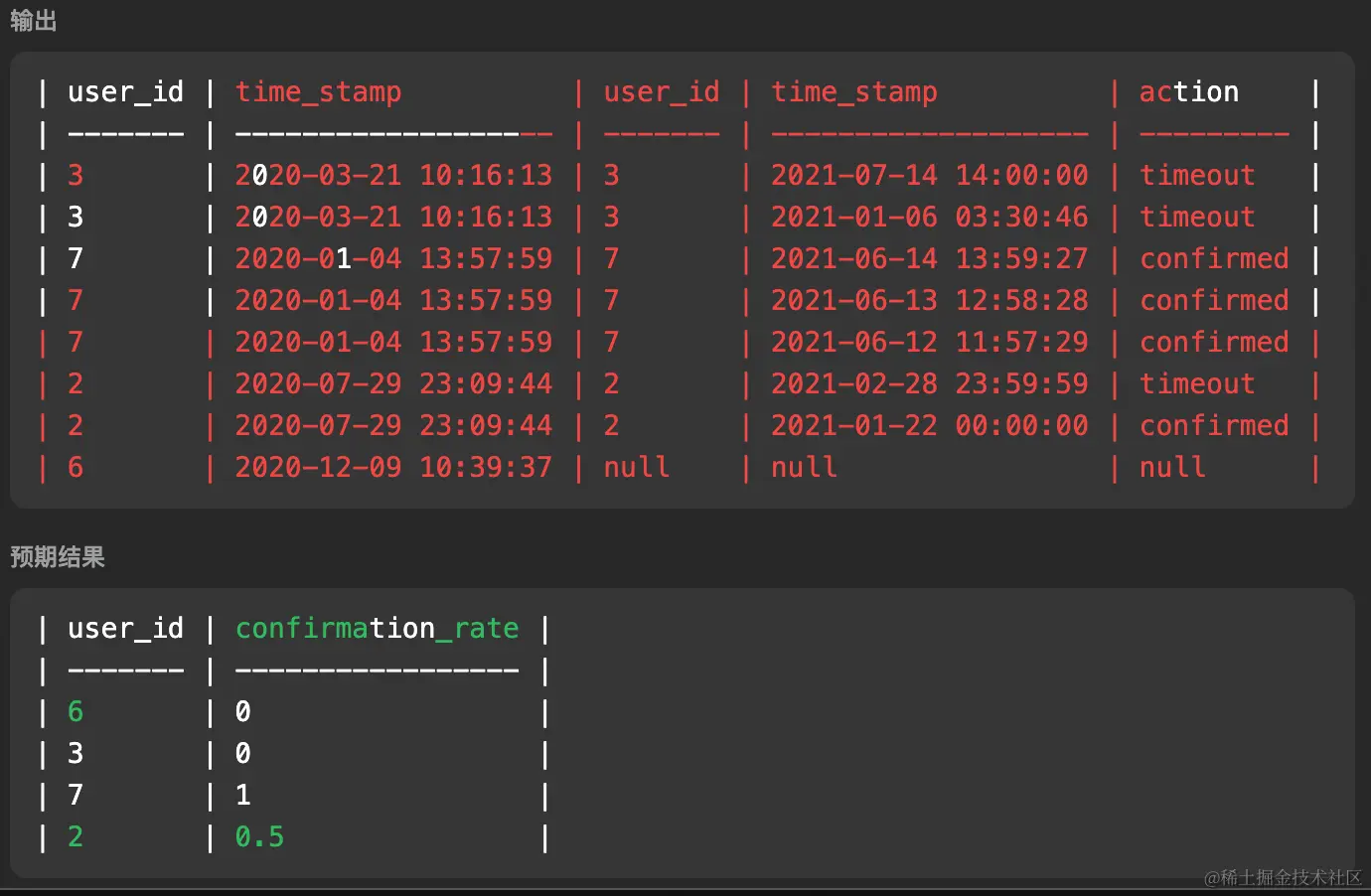 - 利用上面老哥那边学过的三元表达式,用来统计平均值。如果 action 为 confirmed 就为 1,否则其他情况为 0。用 avg 和 round 包裹,即可获取确认率。