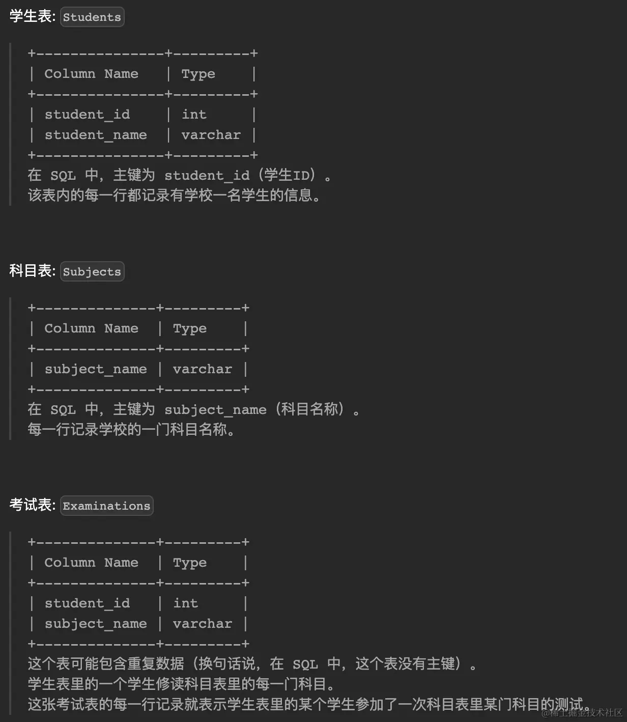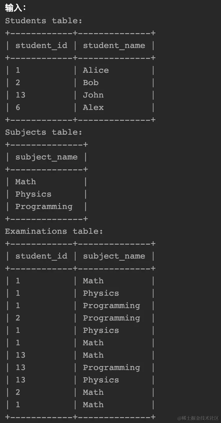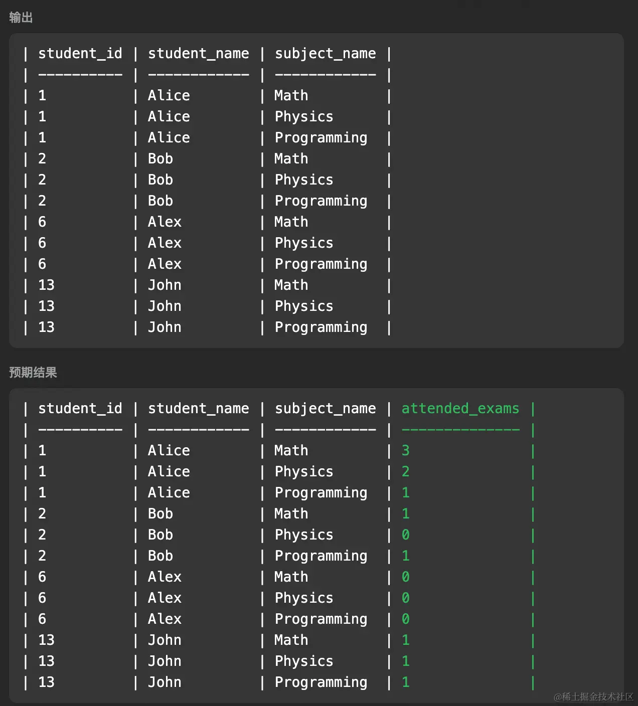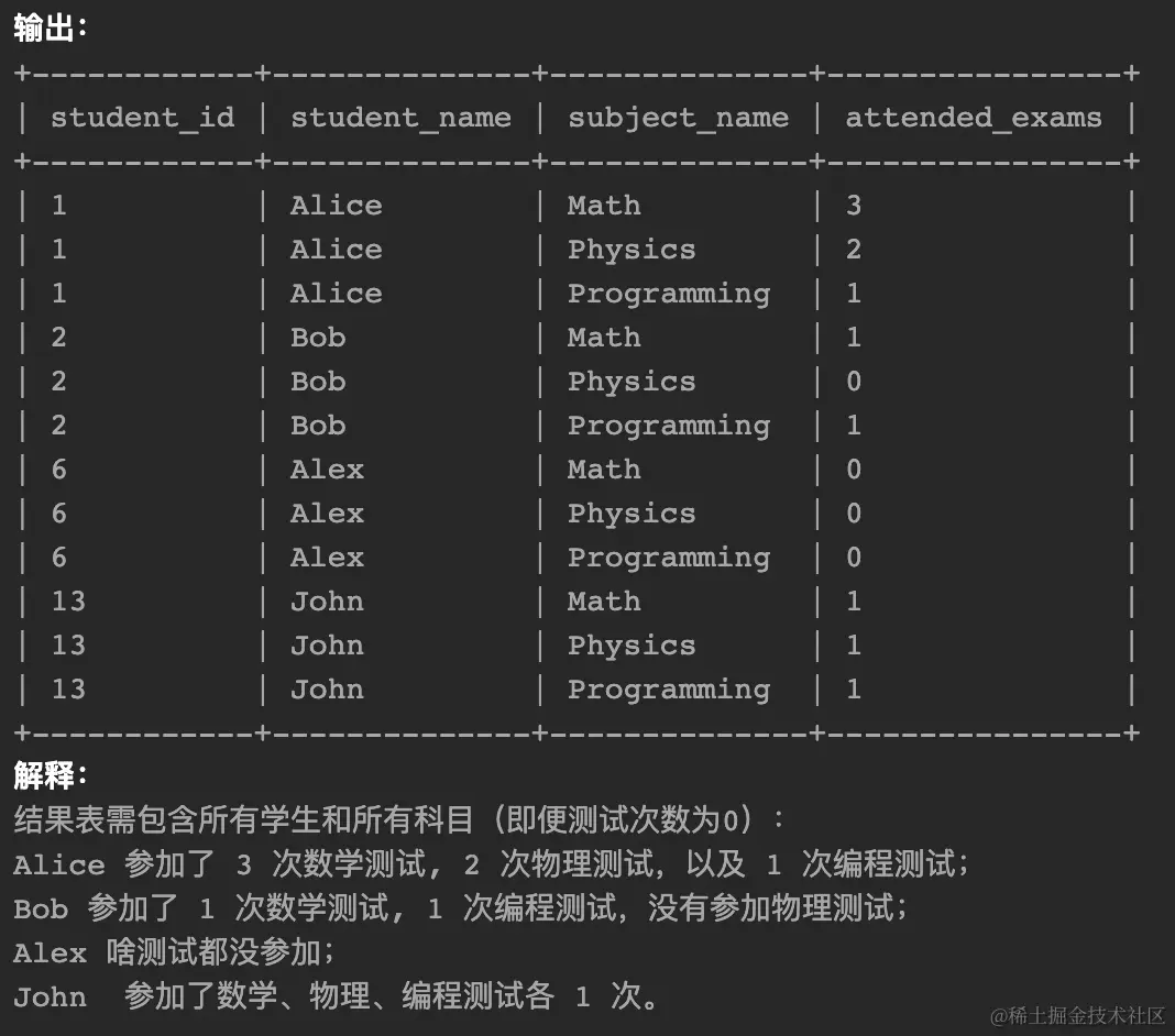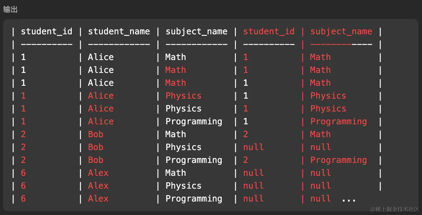 这样就查出来了所有学生的考试记录,没考试过的也会记录在里边(没考试过的右侧 student_id 和 subject_name 会被标记为 NULL)
