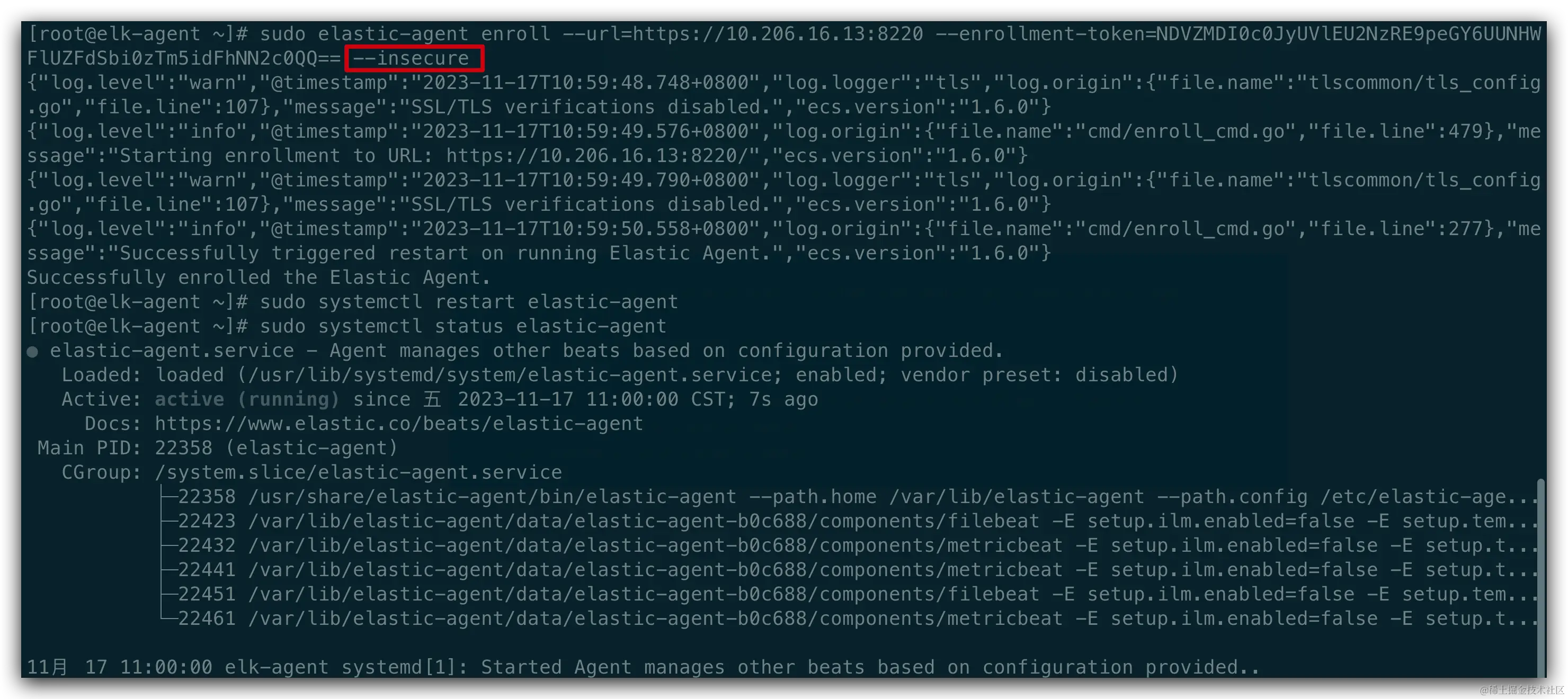 sudo elastic-agent enroll --url=https://127.0.0.1:8220 --enrollment-token=QlVjxxxxxxxxTZBQQ== --insecure