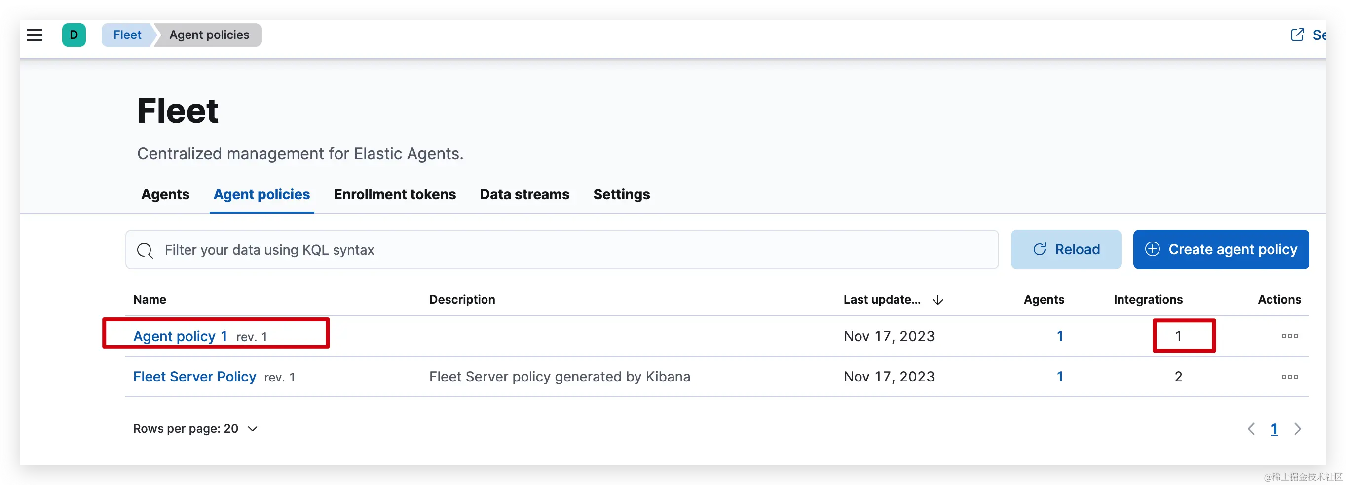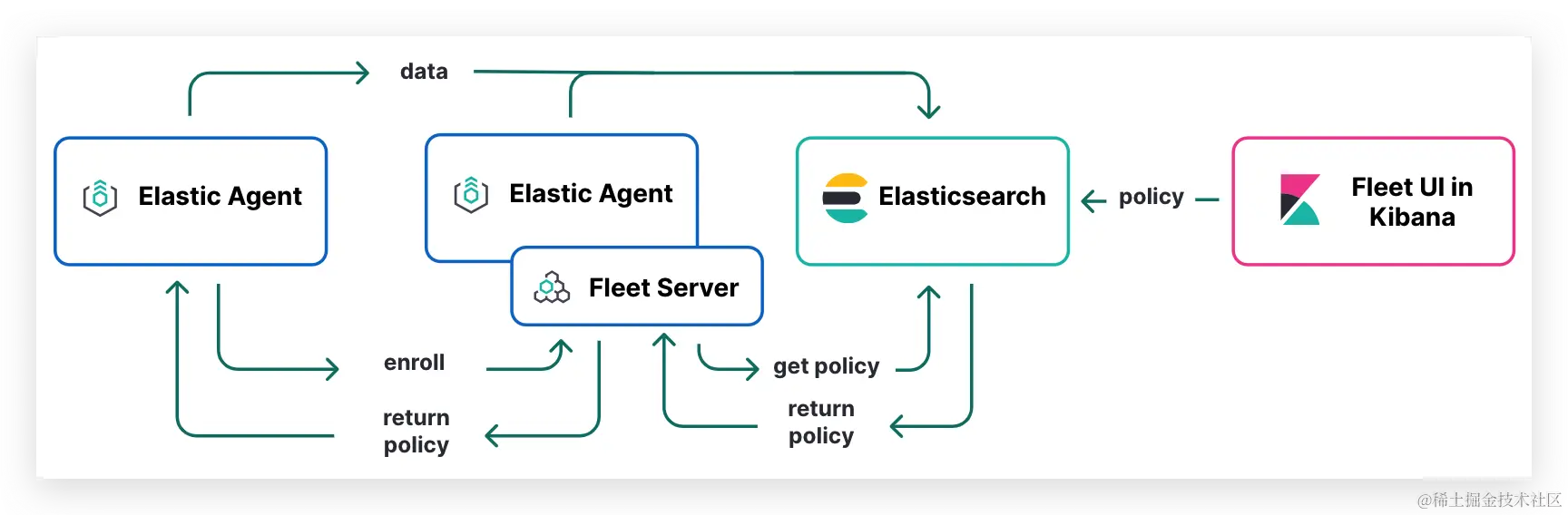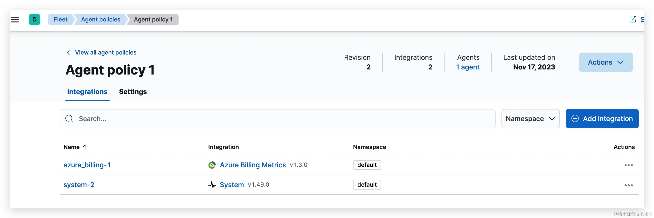 - Elastic Agent policies:要在哪些主机上运行哪些集成。您可以将弹性代理策略应用于多个代理,从而使大规模管理配置变得更加容易。当您添加集成时,您可以配置日志和指标的输入,例如Nginx访问日志的路径。完成后,将集成保存到一个Elastic Agent策略中。下次注册的代理签到时,他们会收到更新的信息。自动部署策略比使用SSH、Ansible剧本或其他工具自己部署策略要方便得多。