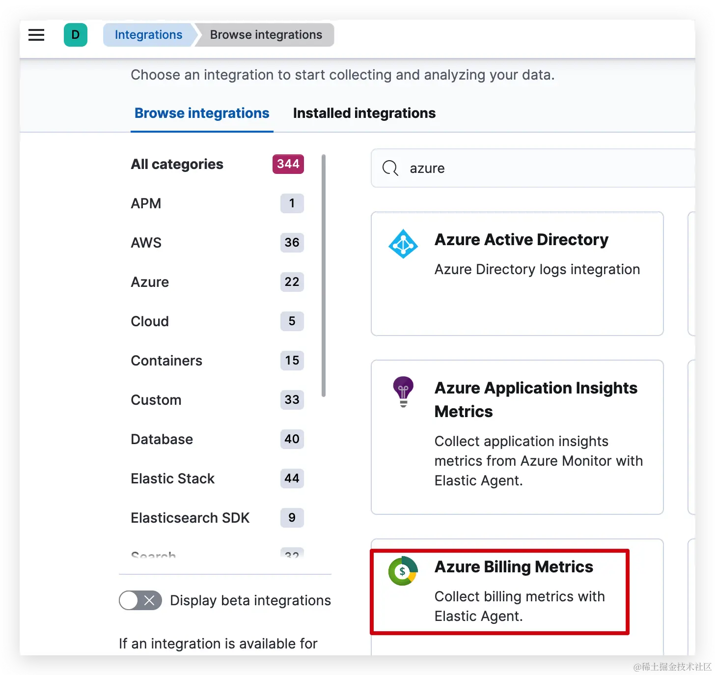 集成中根据自己需求选择对应的集成应用,在此选择Azure Billing Metrics