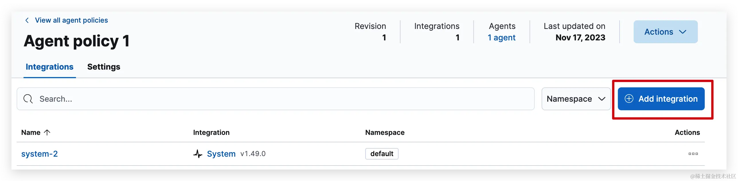 在Agent policies关联的Policies上绑定集成。