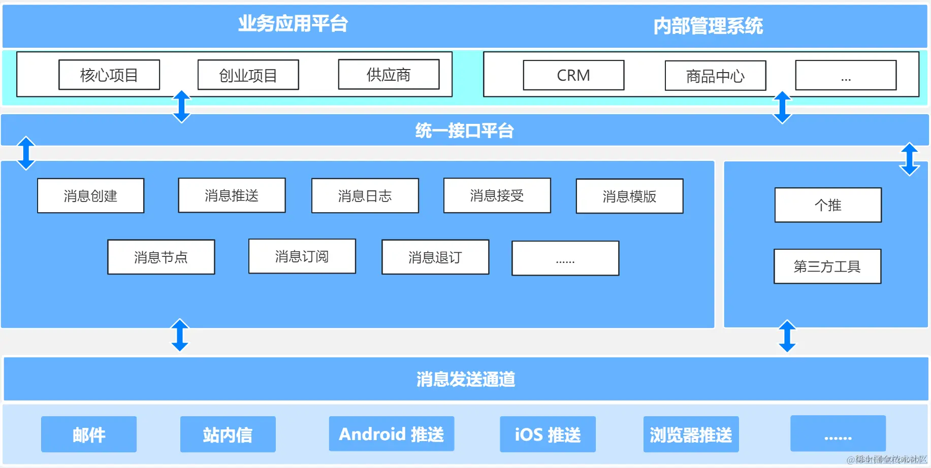 消息推送中台需要提供用户管理和消息订阅功能。用户管理模块负责管理用户信息和推送配置,包括用户标识、设备信息、消息接收偏好等;消息订阅模块用于用户对不同类型的消息进行订阅和取消订阅,以实现个性化推送。 -