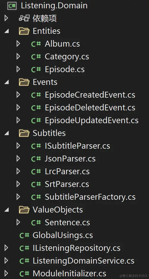 - 有两个应用层项目:后台应用层Listening.Admin.WebAPI(增删改查的微服务)、前台应用层Listening.Main.WebAPI(普通用户访问的界面提供数据的微服务)。共享同一个领域层、基础设施层