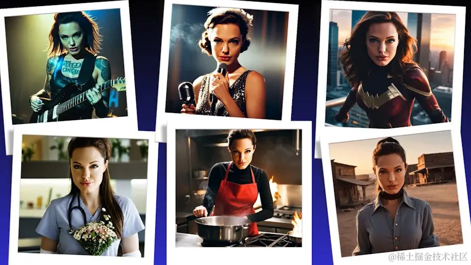 比如说,我用同一张 Angelina 的头像作为参考图给到 IP Adapter。通过修改不同的提示词,就能生成 Angelina 的各种风格的照片。