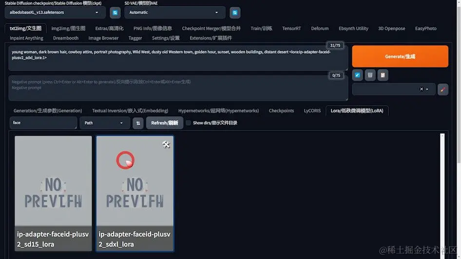 其实,这个新模型也可以在 WebUI 文生图中发挥作用。 我们可以用它来生成各种风格不同的人物肖像,并且保持脸部的一致性。