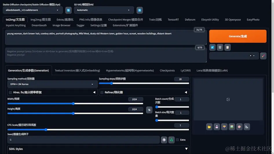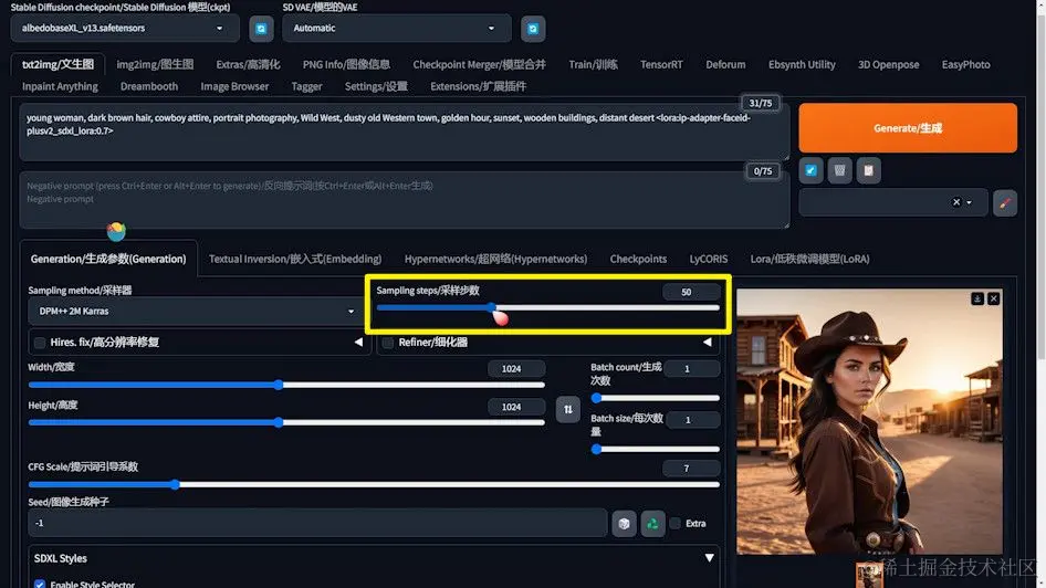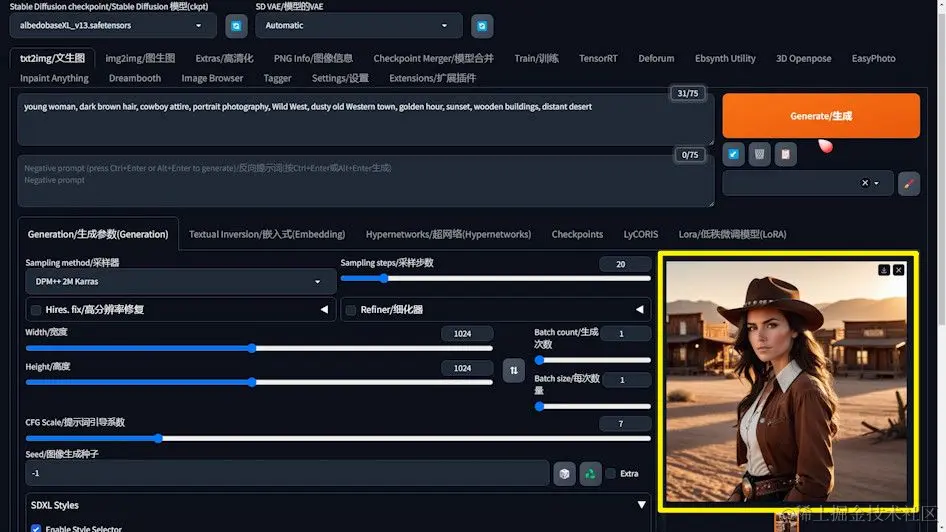 - 提示词定义:精确地定义你想要生成的图像内容。例如,本次我们使用的提示词是描述一个日落时分,身穿牛仔服装的年轻女子在西部小镇的场景。