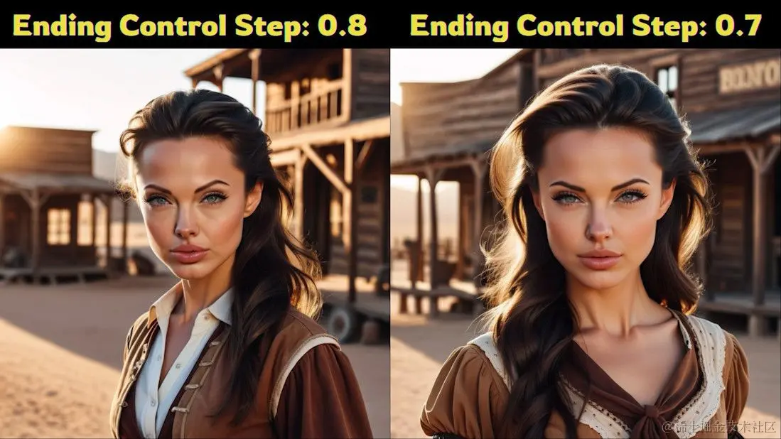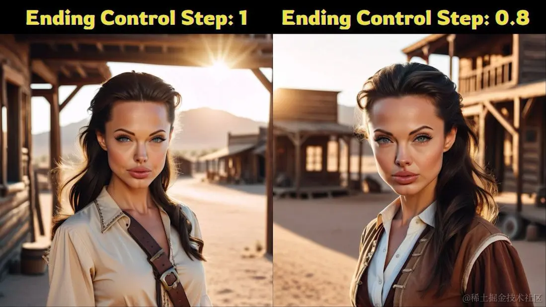 - 步数调整为0.8:首先,将“结束控制的步数”从默认值(通常为1)调整为0.8,然后重新生成图像。这一调整旨在减少夸张的效果,使图像更加符合预期。