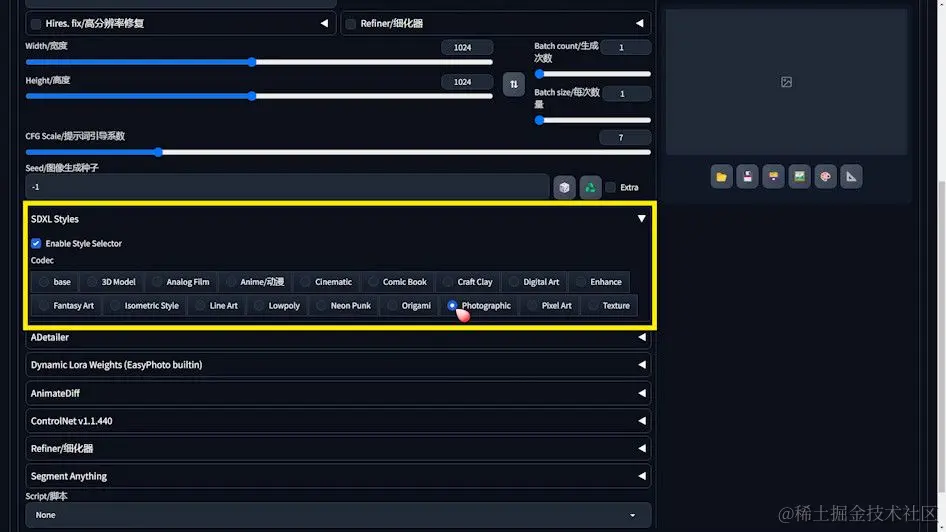- SDXL Styles插件:通过安装SDXL Styles插件,我们能够方便地为生成的图片指定特定的风格。本次选择的是“photographic”(摄影风格),旨在生成接近真实摄影的效果。