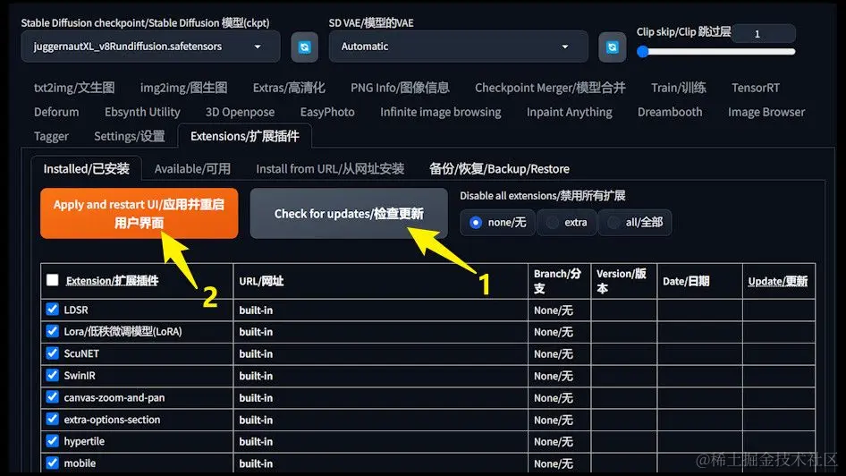 - 更新步骤:在 WebUI 的“扩展插件”标签页中,点击“检查更新”,然后选择“应用并重启用户界面”。重启完成后,ControlNet 应当更新至最新版本。