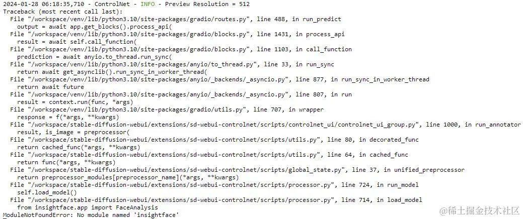 在使用 IP-Adapter FaceID 时,你可能会遇到终端提示No module named 'insightface'的错误,如下图所示: