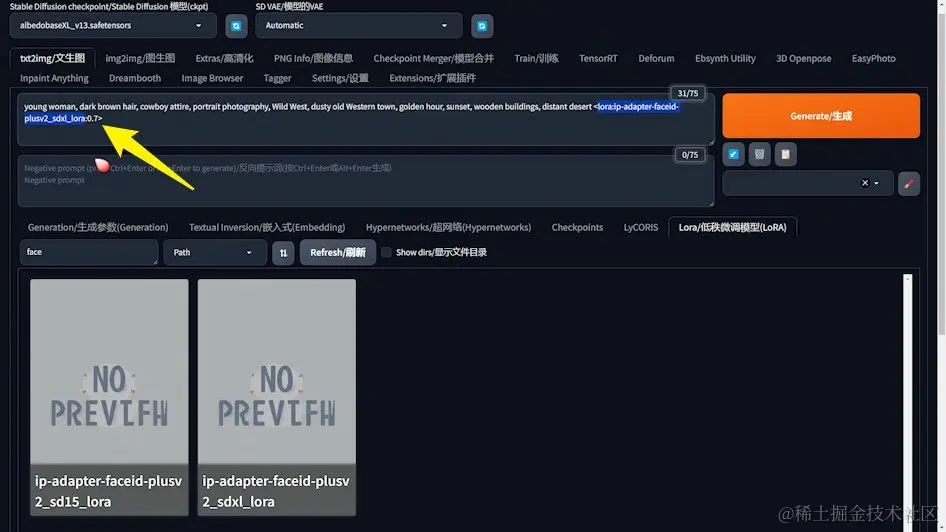 Lora是一个关键组件,能够显著提高生成图像与特定人物相似度的能力。接下来的步骤将引导你如何利用Lora优化人物肖像的生成过程。