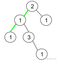 解释:上图为给定二叉树。总共有 3 条从根到叶子的路径:绿色路径 [2,1,1] ,路径 [2,1,3,1] 和路径 [2,1] 。