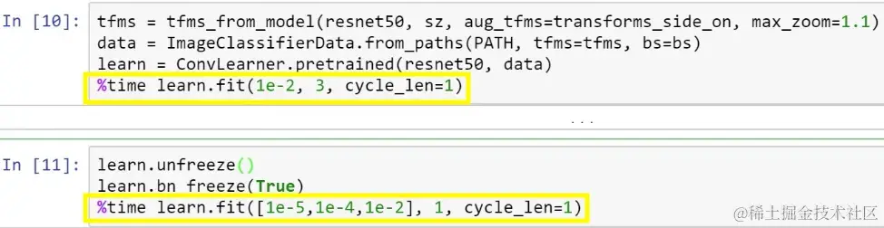 您可以跳过训练最后一层,直接进行不同的学习率,但您可能不想这样做。卷积层都包含预训练权重,因此它们不是随机的 — 对于接近 ImageNet 的东西,它们非常好;对于不接近 ImageNet 的东西,它们比没有好。然而,我们所有的全连接层都是完全随机的。因此,您始终希望通过先训练它们使全连接权重比随机更好一些。否则,如果直接解冻,那么您实际上将在后续层仍然是随机的情况下摆弄那些早期层的权重 — 这可能不是您想要的。