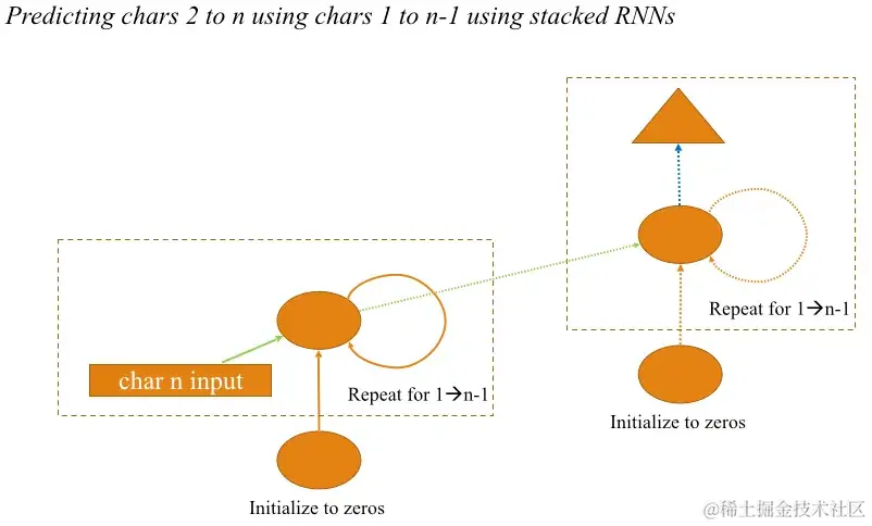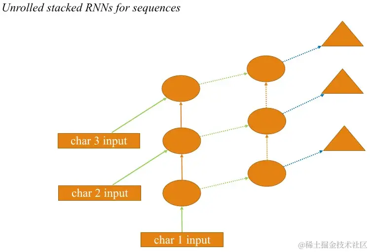 我们还学到可以将这些层堆叠在一起[21:41]。所以与其上面图中的左侧 RNN 输出,它们可以将输入传递到第二个 RNN 中。如果你此时在想“我想我理解了,但我不太确定”,那意味着你并没有理解。你真正理解的唯一方法是从头开始用 PyTorch 或 Numpy 编写这个。如果你做不到,那么你知道你并没有理解,你可以回去重新观看第 6 课,并查看笔记本,复制一些想法,直到你能够。重要的是你能够从头开始编写它——不到一屏的代码。所以你要确保你可以创建一个 2 层的 RNN。下面是展开它的样子。