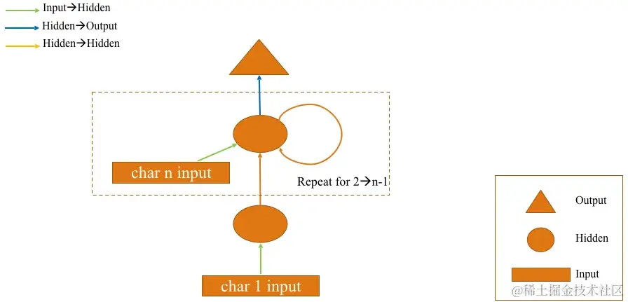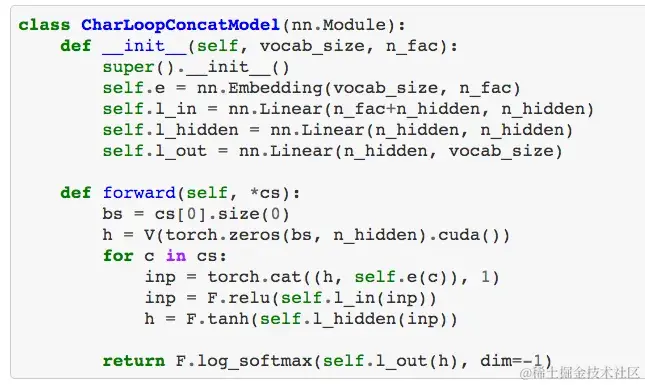 我们不仅重新绘制了它,还将 PyTorch 中的四行线性代码替换为一个 for 循环。记住,我们有一个与下面完全相同的东西,但只有四行代码说self.l_in(input),我们用一个 for 循环替换了它,因为这样重构很好。不改变任何数学、任何想法或任何输出的重构是一个 RNN。它将代码中的一堆单独的行转换为 Python 的 for 循环。
