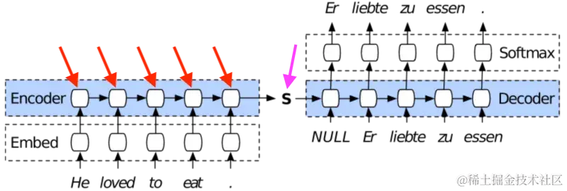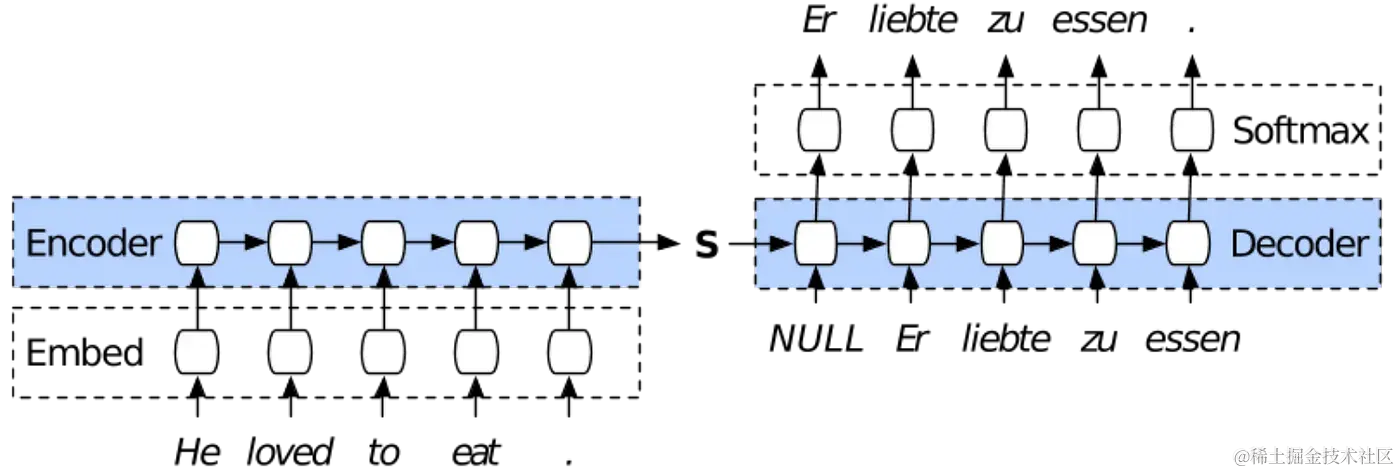 这听起来更像是语言模型而不是分类器,因为语言有多个标记(对于每个输入单词,都有一个输出单词)。但语言模型也更容易,因为语言模型输出中的标记数量与语言模型输入中的标记数量相同。不仅它们的长度相同,而且它们完全匹配(例如,单词一后面是单词二,单词二后面是单词三,依此类推)。对于翻译语言,你不一定知道单词“he”会被翻译为输出的第一个单词(不幸的是,在这种特殊情况下是这样的)。很多时候,主语宾语顺序会有所不同,或者会插入一些额外的单词,或者我们需要添加一些代词,性别化的文章等。我们将要处理的关键问题是,我们有一个任意长度的输出,其中输出中的标记与输入中的特定标记的顺序不对应。但总体思路是一样的。这里有一个 RNN 来编码输入,将其转换为一些隐藏状态,然后我们要学习的新内容是生成一个序列输出。