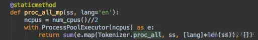 在这里,你们中没有人会遇到 RAM 问题,因为这不是特别大的语料库,但是有些学生在这一周尝试训练新的语言模型时遇到了 RAM 问题。如果你遇到了,了解这些函数(proc_all_mp)实际在做什么是值得的。proc_all_mp正在跨多个进程处理每个句子: