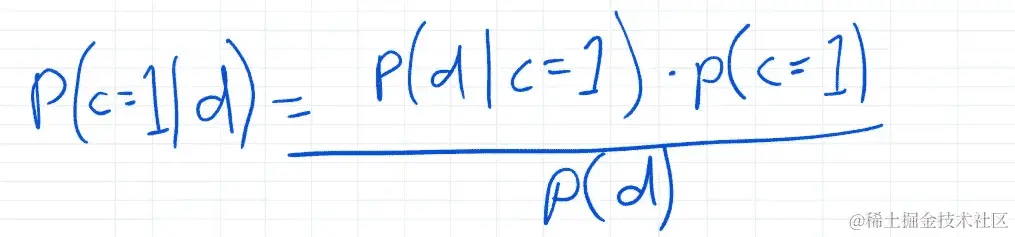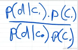 基本上这意味着我们想要计算的是在类别为 1 的情况下得到这个特定文档的概率乘以类别为 1 的概率除以在类别为 0 的情况下得到这个特定文档的概率乘以类别为 0 的概率:
