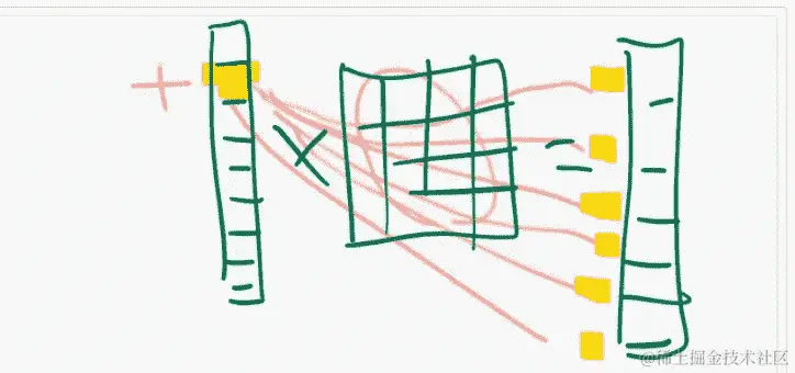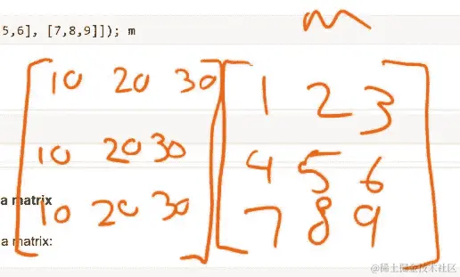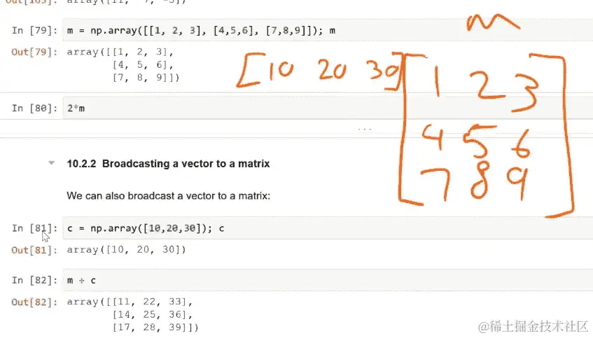 但是(m * c)这不是矩阵乘法。那是什么?逐元素广播。但请注意,它创建的数字[10, 40, 90]正是我在做矩阵乘法的第一部分时需要计算的三个确切数字(1*10 + 2*20 + 3*30)。