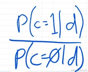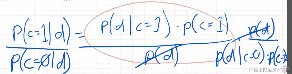 好的,如果这个数字大于 1,那么更有可能是类别 1,如果小于 1,更有可能是类别 0。所以在这种情况下,我们可以将整个事情除以类别 0 的相同版本,这等同于乘以倒数。所以好处是现在*p(d)*被取消了,下面是给定类别 0 时得到数据的概率,这里是得到类别 0 的概率。
