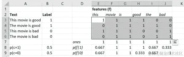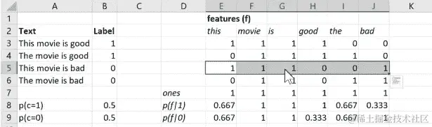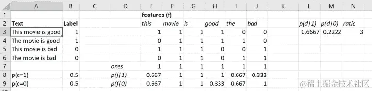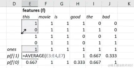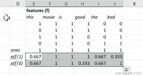 所以这就像是在文档中feature = 'this'出现的概率,假设class = 1(即this的p(f|1))。