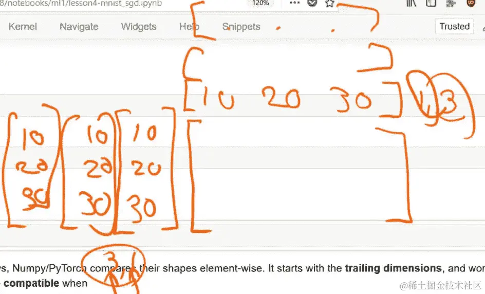 有趣的是,数据科学或机器学习社区中很少有人理解广播,大多数时候,例如,当我看到人们为计算机视觉进行预处理时,比如减去平均值,他们总是在通道上写循环。我认为不必这样做非常方便,而且通常不必这样做速度更快。所以如果你擅长广播,你将拥有这种非常少数人拥有的超级有用的技能。这是一种古老的技能。它可以追溯到 APL 的时代。APL 是上世纪 50 年代的,代表着 A Programming Language,肯尼斯·艾弗森写了一篇名为“符号作为思维工具”的论文,他在其中提出了一种新的数学符号。他提出,如果我们使用这种新的数学符号,它会给我们提供新的思维工具,让我们能够思考以前无法思考的事情。他的一个想法就是广播,不是作为计算机编程工具,而是作为数学符号的一部分。因此,他最终将这种符号实现为一种思维工具,作为一种名为 APL 的编程语言。他的儿子继续将其进一步发展为一种名为 J 的软件,这基本上是当你将 60 年来非常聪明的人们致力于这个想法时得到的结果。通过这种编程语言,你可以用一两行代码表达非常复杂的数学思想。我们有 J 是很棒的,但更棒的是这些想法已经进入我们所有人使用的语言中,比如在 Python 中的 numpy 和 PyTorch 库。这些不仅仅是一些小众的想法,它们是思考数学和进行编程的基本方式。