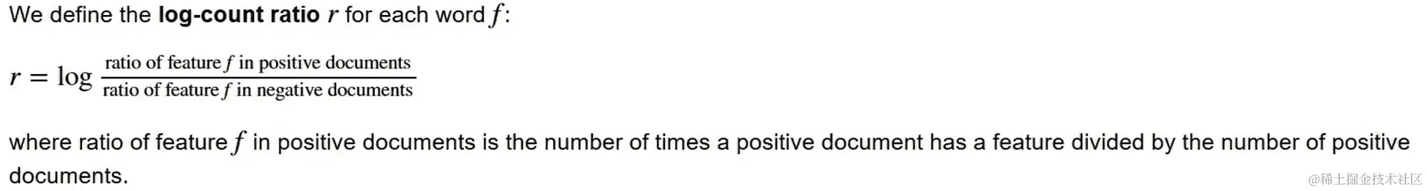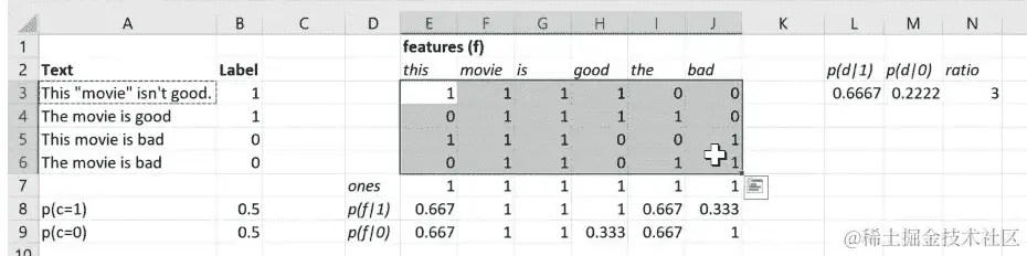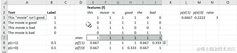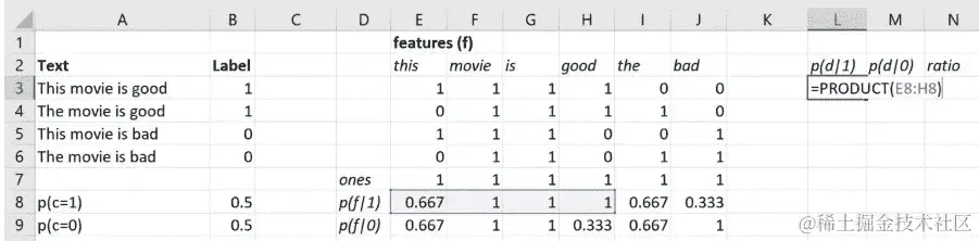 这就是 Excel 版本。所以你可以看出我让 Yannet 来处理这个,因为里面有 LaTeX。我们有实际的数学。所以这里是相同的东西;每个特征f的对数计数比。